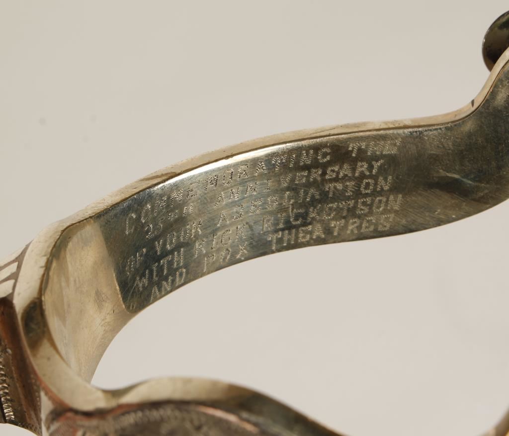 Nickel silver "25th Anniversary of your association with Rick Ricketson and Fox Theaters To Ray Davis Master Showman February 8,1950" inscribed on inside. Beautiful condition.