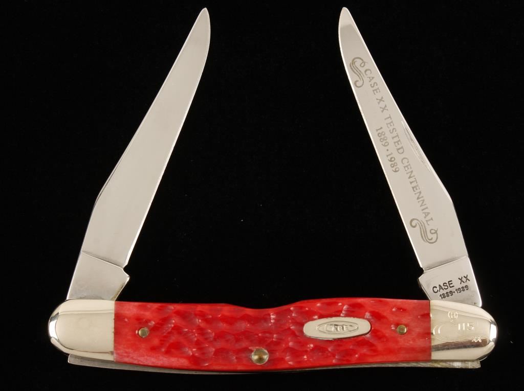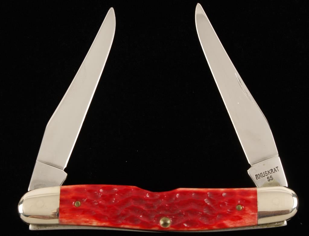 Made in 1989. Stamped "RMuskrat SS". Handles are red jigged bone or Delrin. Bolster is stamped "115" in script "C". Blades are 2-13/16" long and one is etched "Case XX Tested Centennial 1889-1989". Condition is excellent.