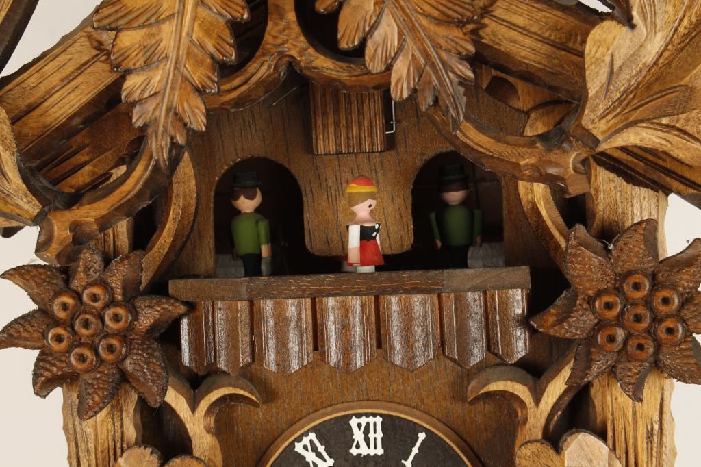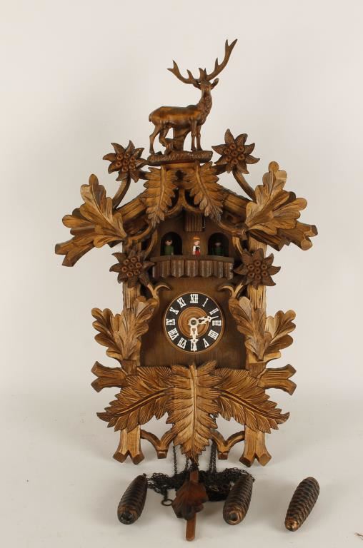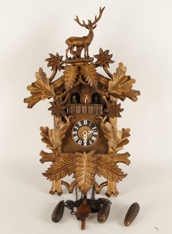 Original Black Forest cuckoo clock made in Germany with dancing figures on the hour. Includes original instruction booklet from Betriebsanleitung. Unknown working condition, appears to be excellent overall.