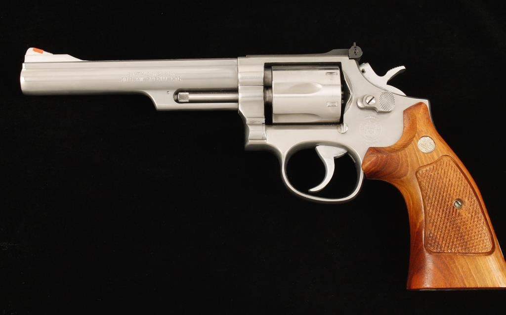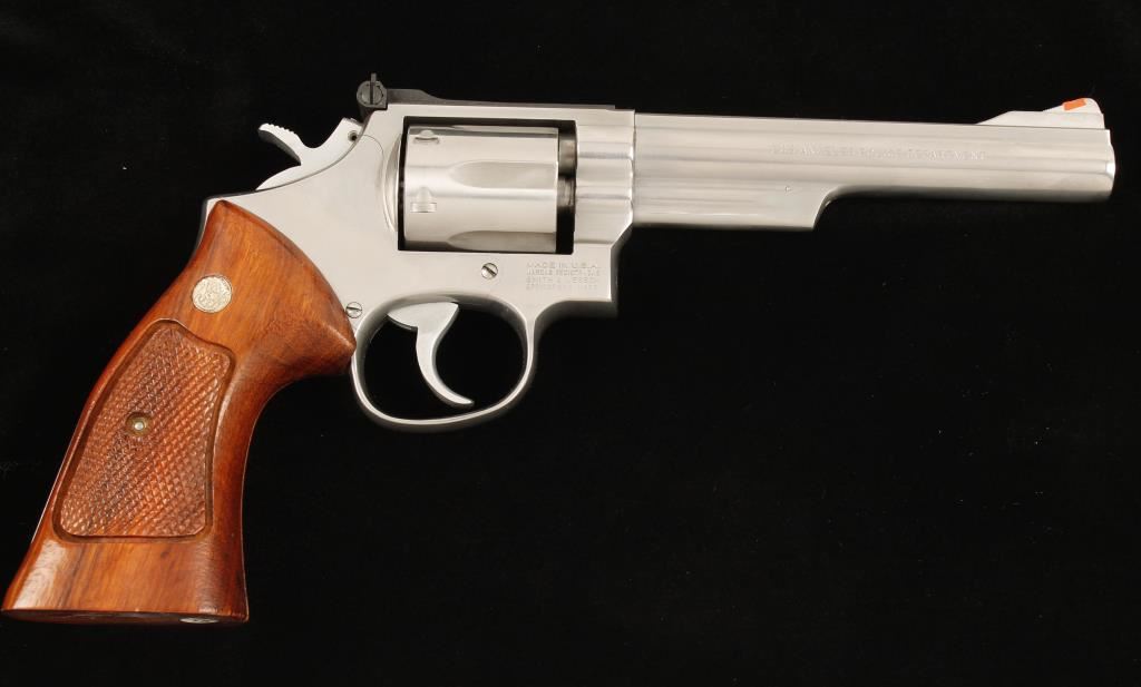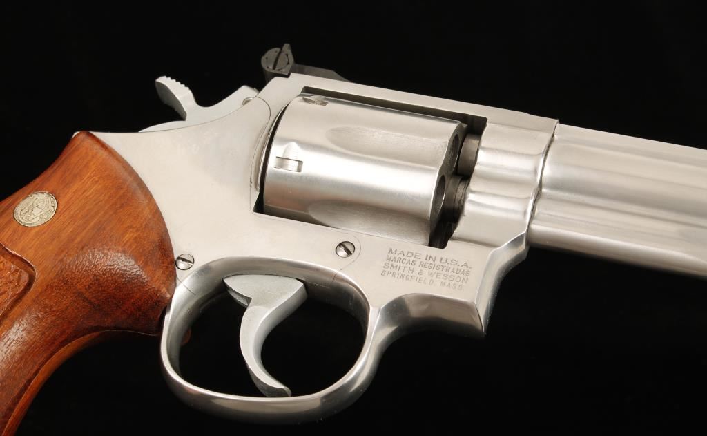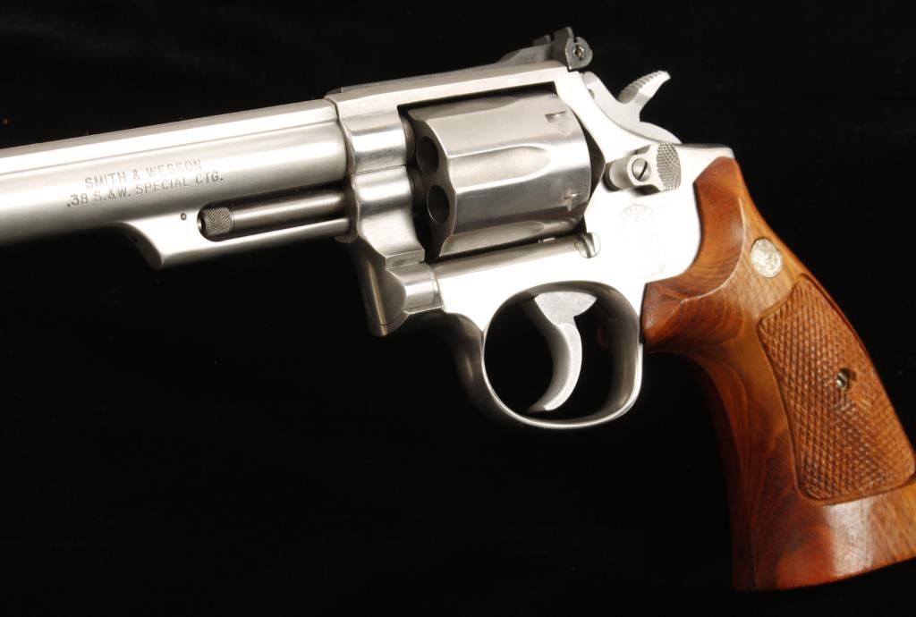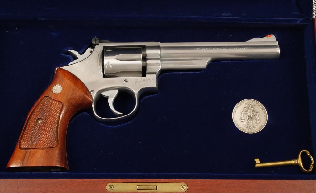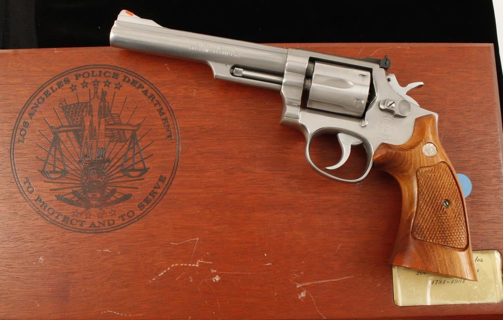 Stainless steel 6-shot double-action revolver with a 6" barrel, wood magna grips and a velvet lined locking wood display box with key and documents. This is a 200th anniversary issue for the City of Los Angeles and it says so on a plaque on the lid of the box as well as having the police crest burnt into it. The pistol has "Los Angeles Police Department" inscribed on the barrel. Also in the box there is a medallion bearing the Police Department crest. Metal finish shows a tiny drag line, an overall dullness with no imperfections and an over-stamped model number that was 66-2 but then had an "8" stamped over the second "6". The wood grips are faultless. The bore and chambers are impeccable. Action is smooth and the lock-up is rock solid. We also offer another LAPD K-.38 Combat Masterpiece in this auction with a consecutive serial number (AEU5091). Condition is excellent. *Modern Firearm*