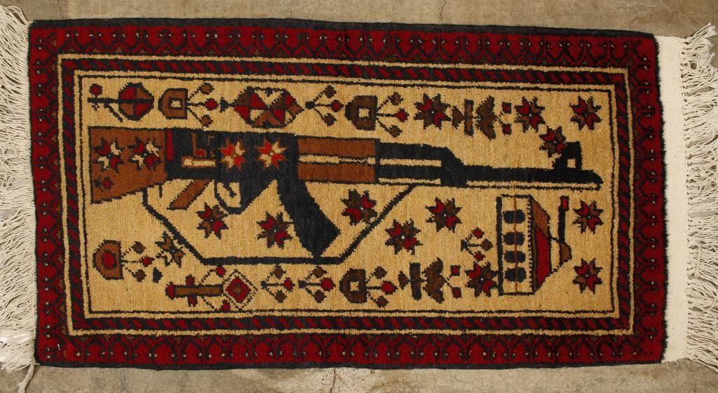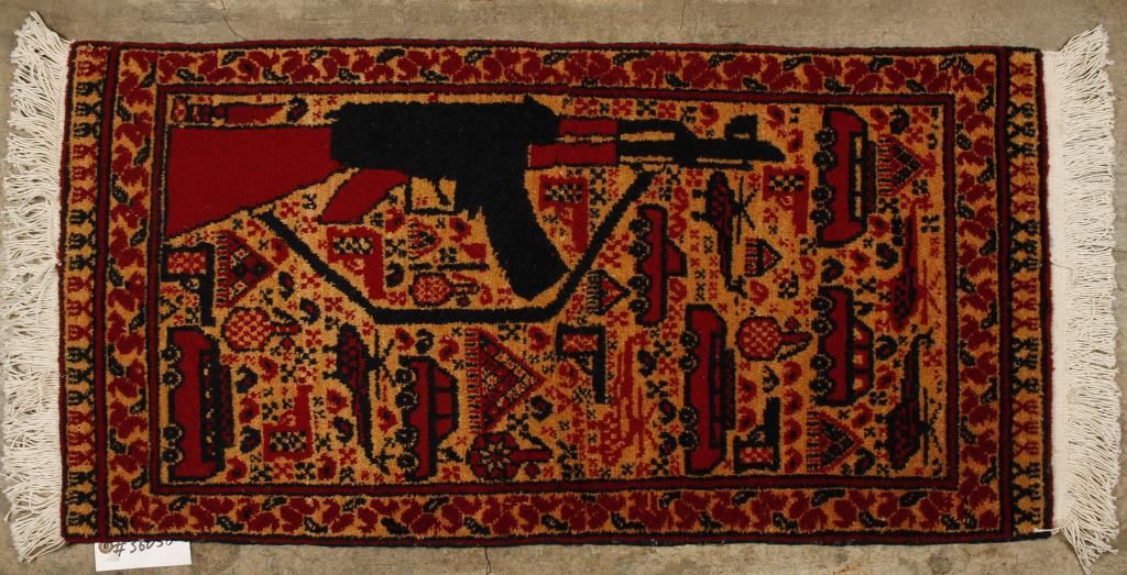 (1) AK and building design, measures 1.8'x3.2', In overall very good condition. (1) AK, pistols, and bomb design. In overall very good condition. Measures 1.8'X3.3'.