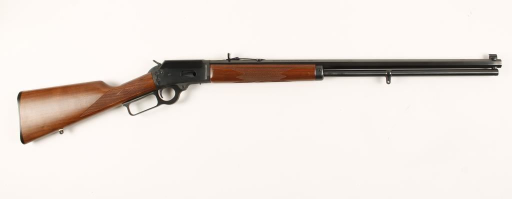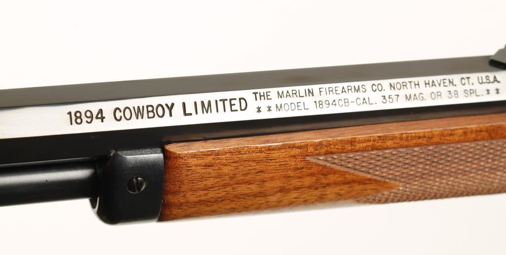 Blued lever-action rifle with a 24" octagon JM marked barrel, adjustable rear sight, checkered walnut furniture, cross-bolt safety, hard rubber butt plate and sling swivel studs. "1894 Cowboy Limited". Metal finish is unblemished. Action is flawless. Bore is shiny with strong rifling. Wood has sharp checkering and shows less than 5 rub marks. Condition is excellent. *Modern Firearm*