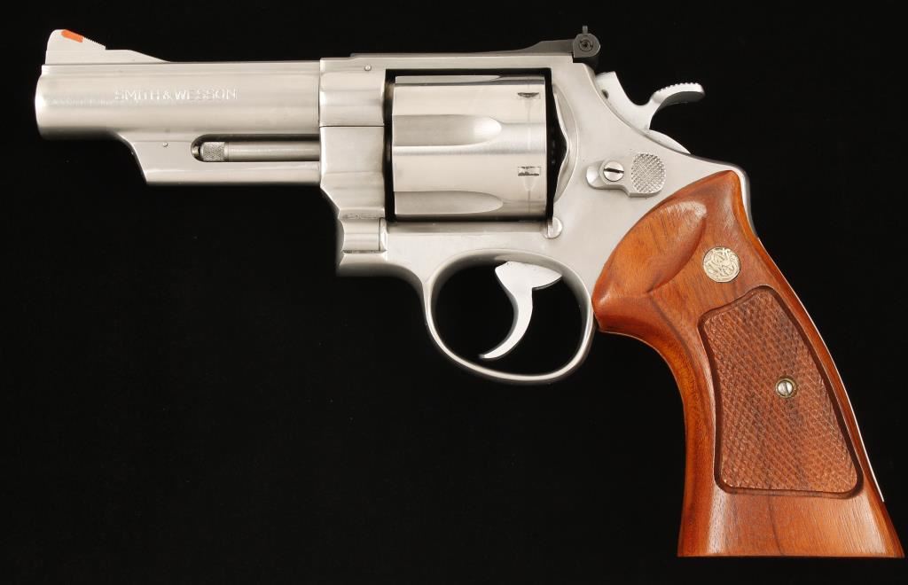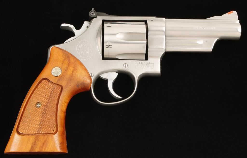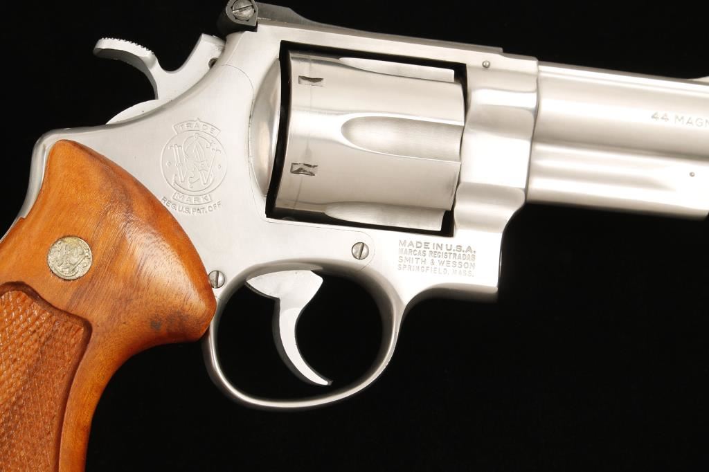 Stainless steel six shot double action revolver built on Smith & Wesson's N target frame and chambered in .44 Magnum/.44 Special. Model number on frame reads "MOD-6291" but the 1 appears to be an afterthought. Features a 4" pinned and ribbed barrel with extractor shroud, ramp on ramp front sight with orange insert, micrometer click adjustable rear sight, fluted cylinder, checkered wide spur target hammer, smooth target trigger, serrated backstrap and checkered Smith & Wesson medallion wood grips. Finish shows many small superficial scratches but remains very nice. Bore is bright and action is great. Condition is very good. ***Modern Firearm***