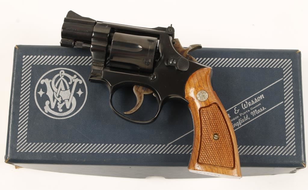 Blued and case-colored 6-shot double-action square-butt revolver with a 2" barrel, adjustable rear sight, factory box with tools and documents. Metal finish shows a drag line, matte topstrap on the barrel and serrations on the frame rib and one ding on the trigger guard. Case coloring still has bright colors. Wood grips have one dent on the right butt. Bore is shiny with sharp rifling and the chambers are bright. Box end says that it was shipped with both long and short barrels but only the installed short barrel is present. Action is very nice and the lock-up is almost rock solid. Condition is excellent. *Modern Firearm*