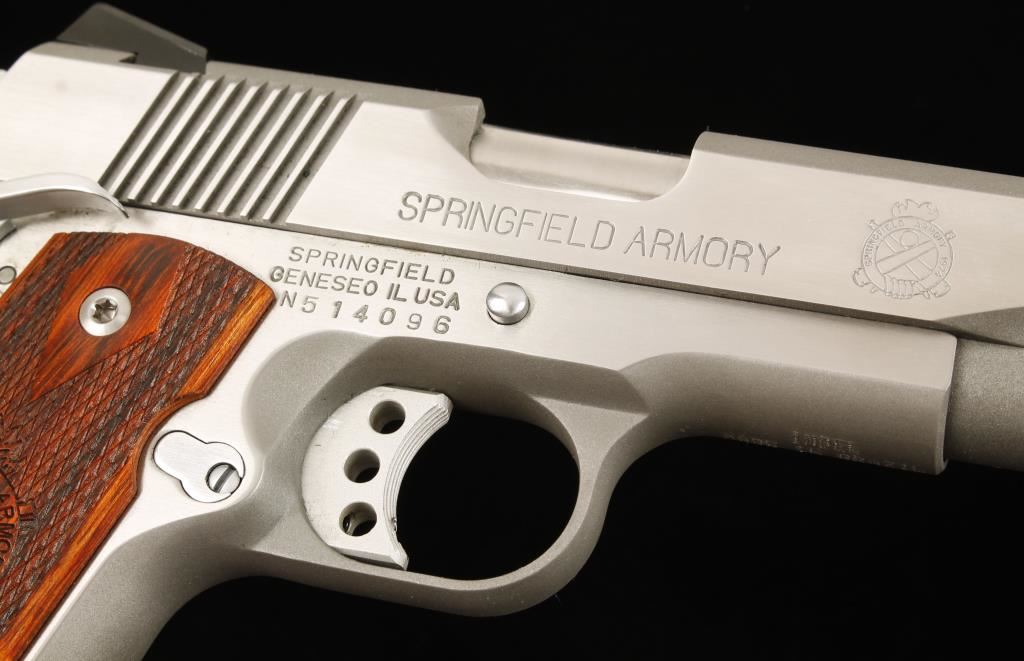 Stainless single-action semi-automatic pistol with a 3-1/2" barrel, tritium Novak style sights, beavertail grip safety, extended ambi thumb safety, integral locking mainspring safety, checkered wood grips, two 6-round magazines, factory box with tools, keys and document. Metal finish is bead blast and brushed stainless with scratches from bolt stop disassembly and a few other tiny rubs. Checkered double-diamond grips with Springfield Armory emblem are in pristine shape. Bore is shiny with sharp rifling. Action works well. Condition is very good. *Modern Firearm*