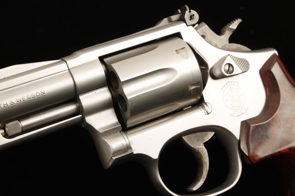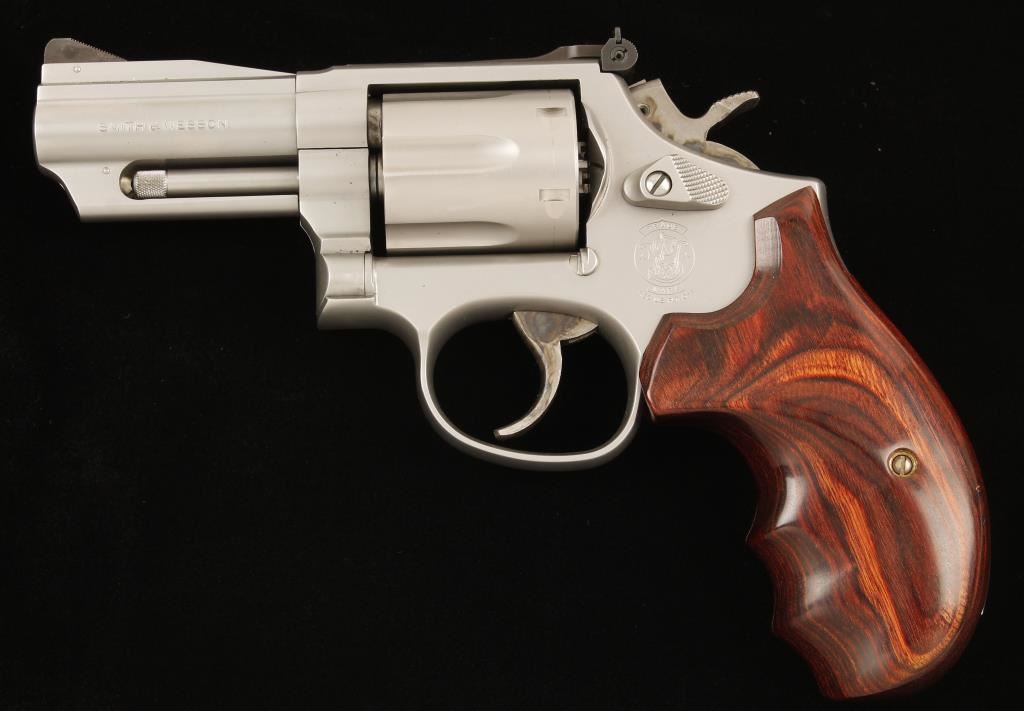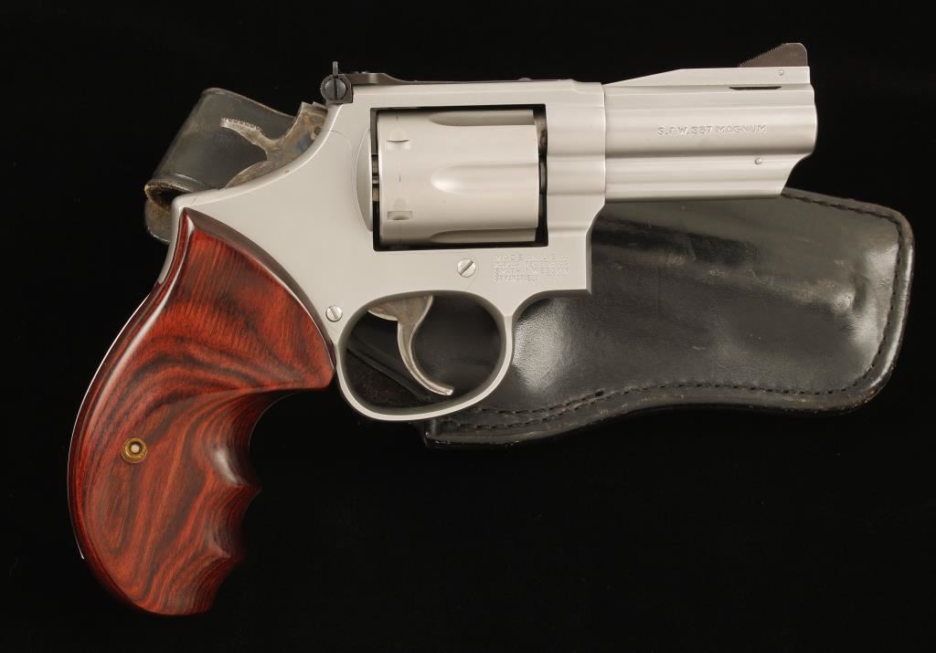 Glass bead finished stainless steel six shot double action revolver. Features a 3" ported barrel, front ramped sight, micrometer click rear sight, full length barrel lug, semi-target case hardened hammer, smooth semi-target case hardened trigger, serrated backstrap and Smith & Wesson laminated wood grips. Includes Safariland black leather fitted holster. Finish shows little to no wear, bore is bright and action is smooth. Condition is excellent. ***Modern Firearm***