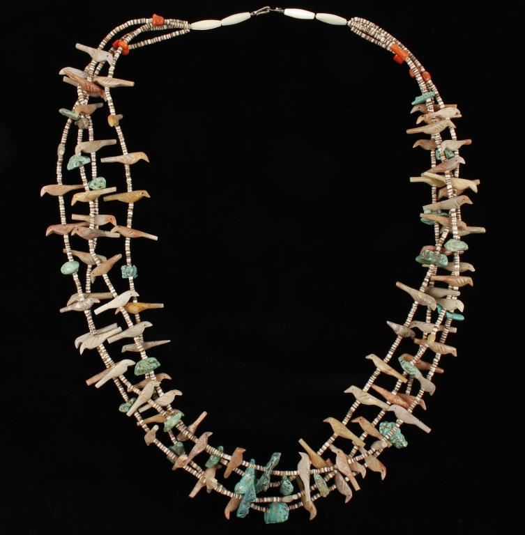 Fetish necklace with turquoise, red coral, shell beads and bird effigy stones. Measures approximately 32" long.