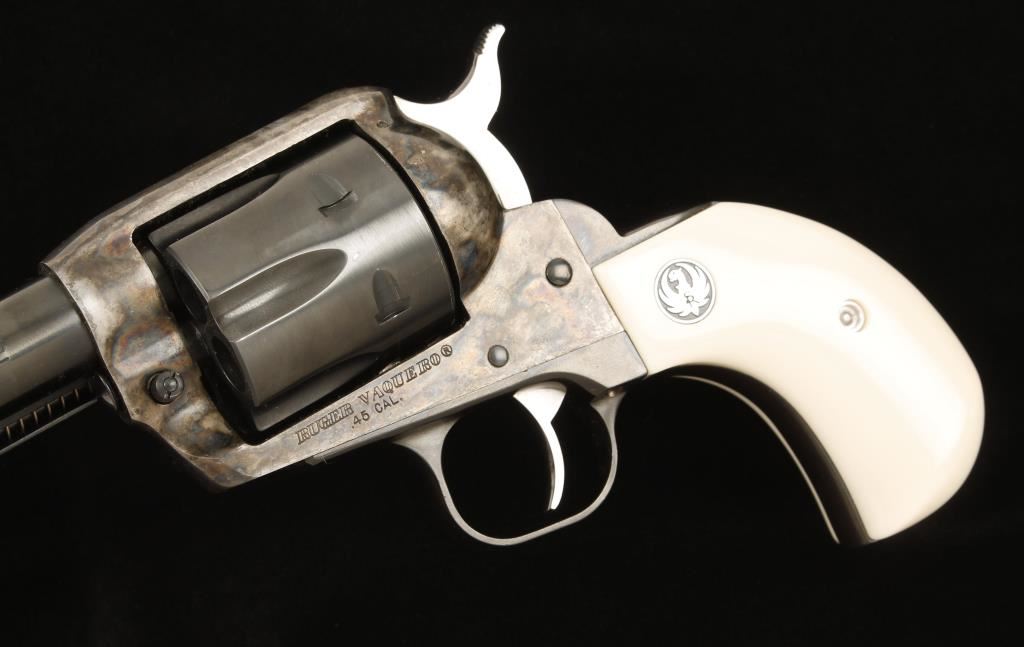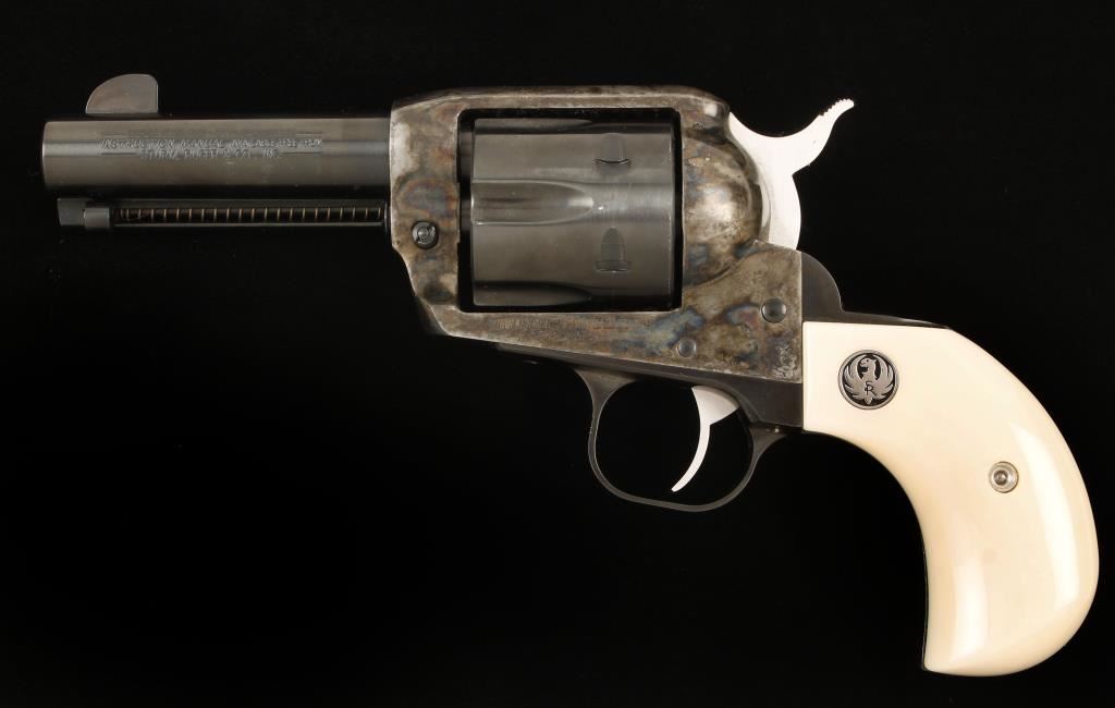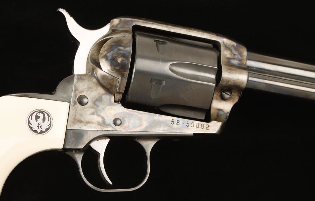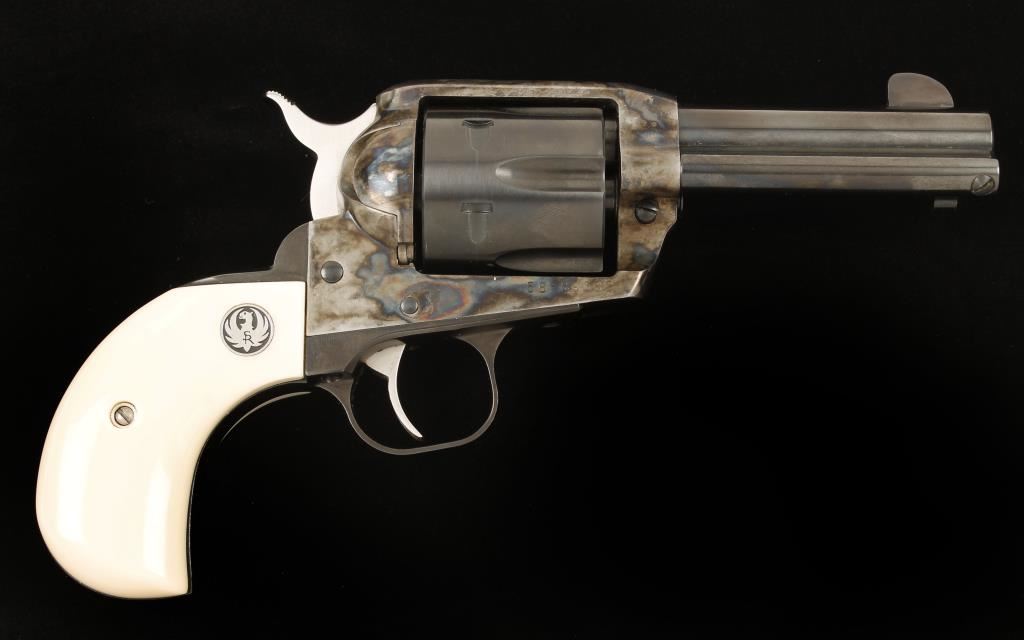 Blued and Case-colored single-action 6-shot revolver with a 3-3/4" barrel and birds-head grip. Barrel, cylinder, hammer, trigger and grip frame are blued steel. Frame is case colored steel. Grips are imitation ivory. Bore is bright with sharp rifling. Chambers are shiny. Action is fine with good lock-up. Metal finish has very few small freckles of rust on the hammer and the frame. Condition is excellent. *Modern Firearm*