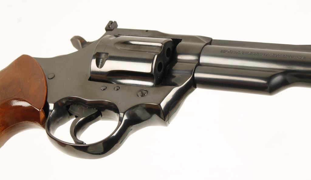 Blued double-action 6-shot revolver with a 4" ribbed heavy barrel, adjustable rear sight, wide trigger, wide spur case-colored hammer and checkered wood medallion grips. Metal finish has a light drag line and a few light, tiny scratches and dings. Bore is bright and shiny with strong rifling and the chambers are Pristine. Action works well with some play in the lock-up. Grips have a few dings. Condition is excellent. *Modern Firearm*