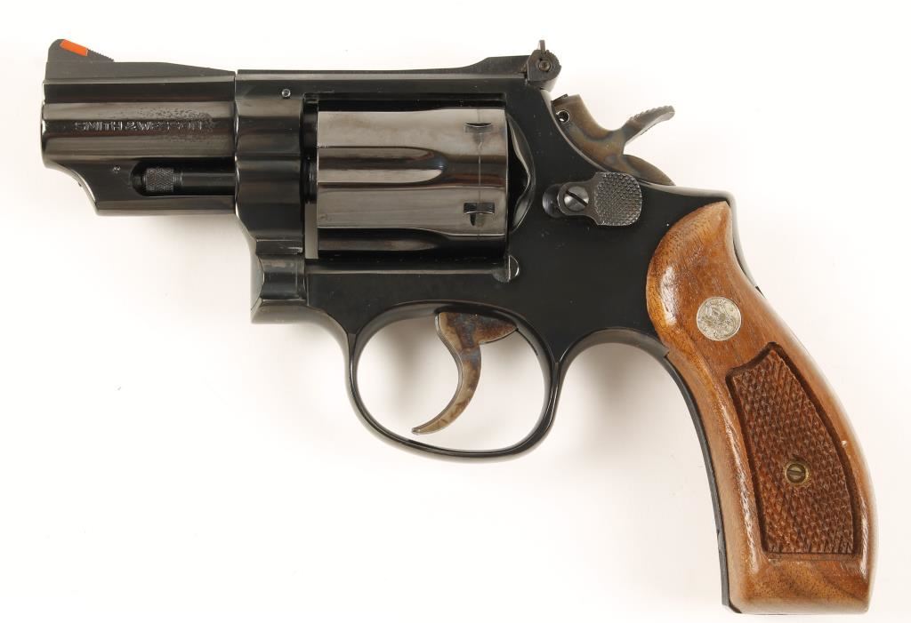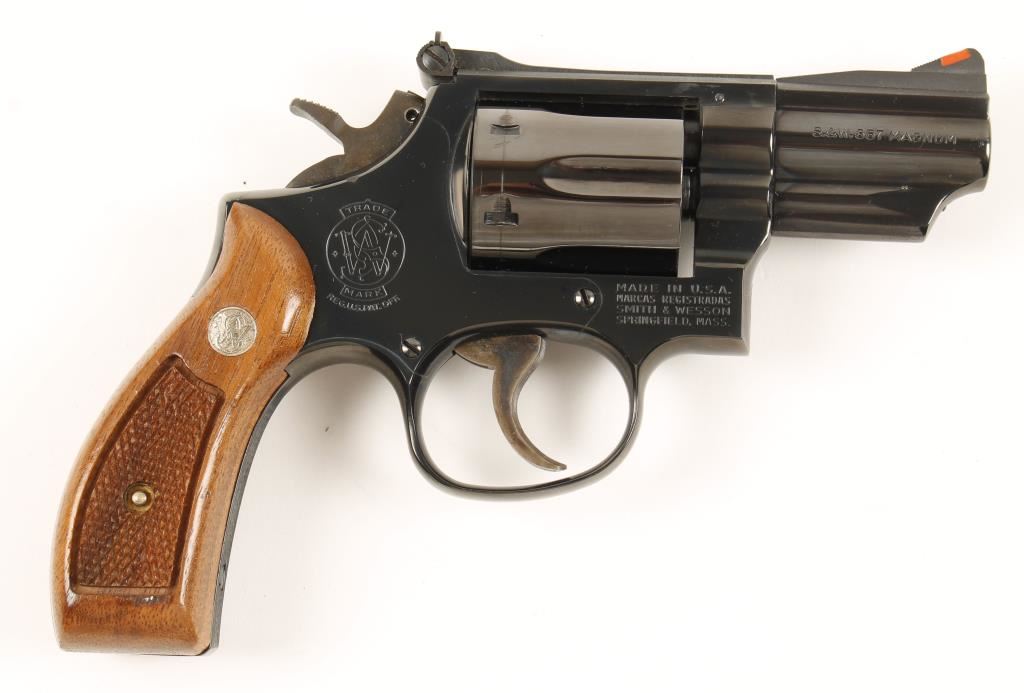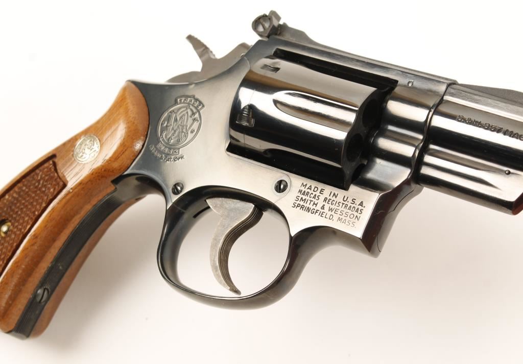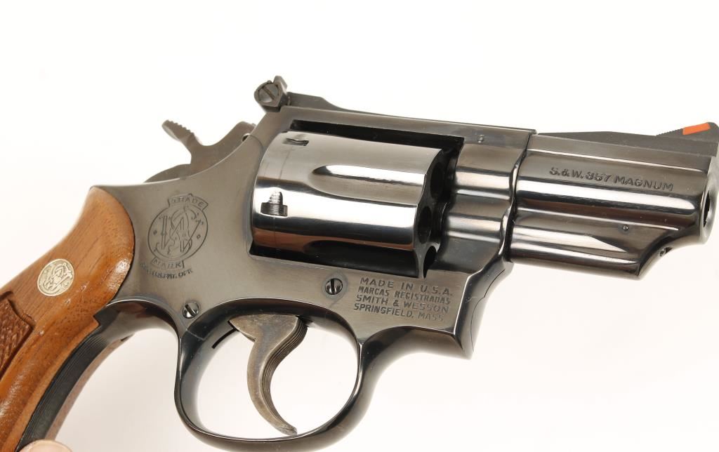 Blued six shot double action revolver chambered in .357 Magnum. Features a 2.5" serrated rib barrel, ramped front sight with orange insert, adjustable micrometer click rear sight, fluted cylinder, serrated trigger, checkered wide hammer spur, serrated front & backstrap and checkered walnut S&W medallion grips. Finish shows minimal handling wear, surface rust emerging on left side of barrel front storage and a drag line. Bore is immaculate and action is strong. Condition is near excellent. ***Modern Firearm***