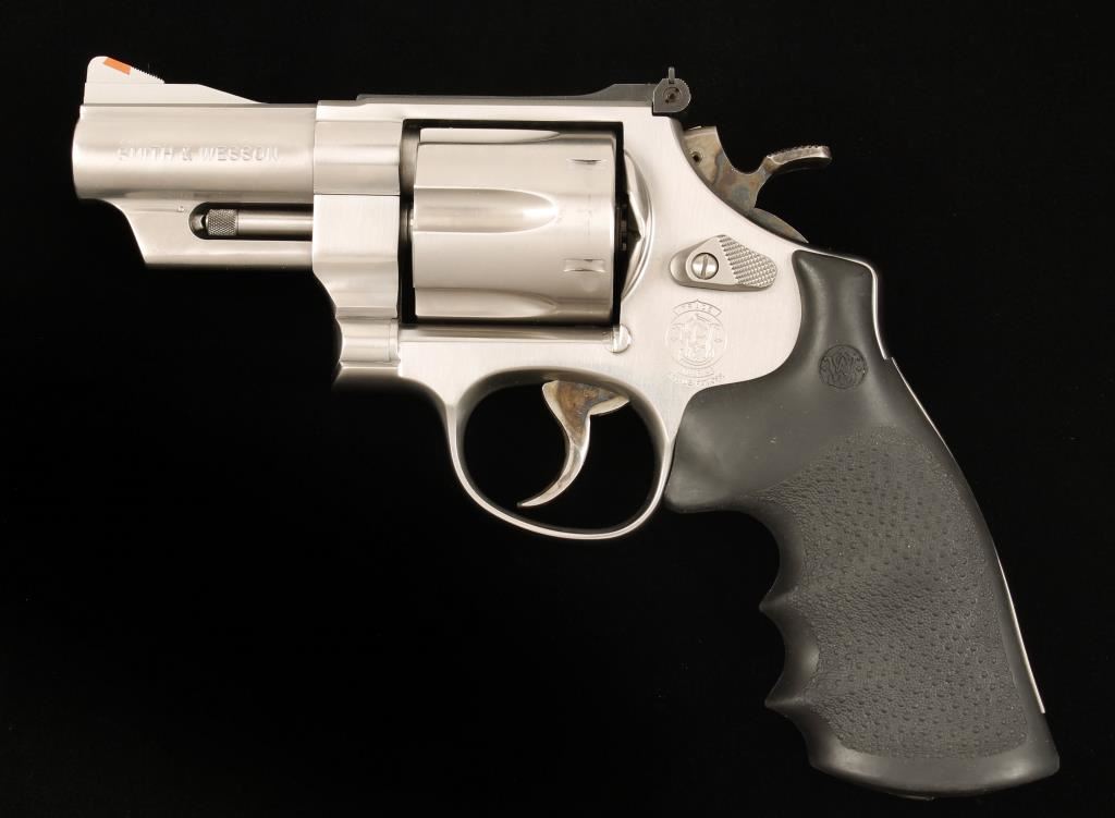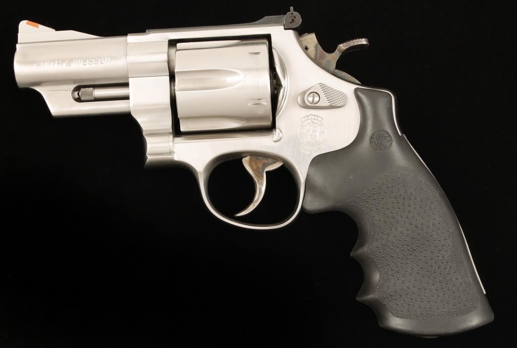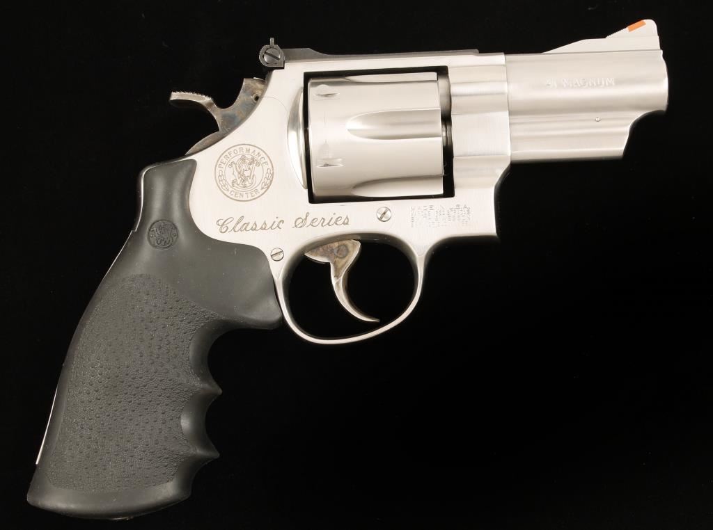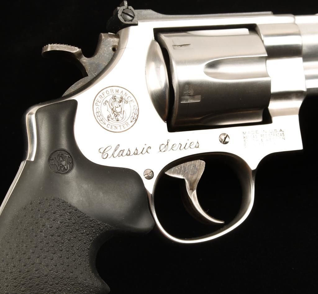 Performance Center Classic Series marked stainless steel six shot double action revolver chambered in .41 Magnum. Features a heavy 3" barrel with serrated barrel rib, shrouded extractor rod, ramped front sight with orange insert, adjustable micrometer click rear sight, fluted cylinder with beveled edges, case hardened target trigger & hammer, checkered wide hammer spur, ten groove serrated backstrap and a S&W emblem Hogue Monogrip with finger grooves. Finish shows minor handling wear, dragline and a blemish on the top strap near the barrel. Bore is excellent as is the action. Condition is excellent. ***Modern Firearm***