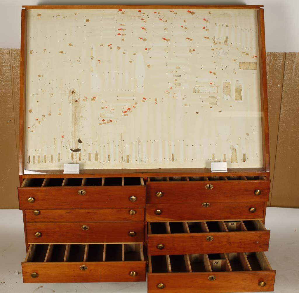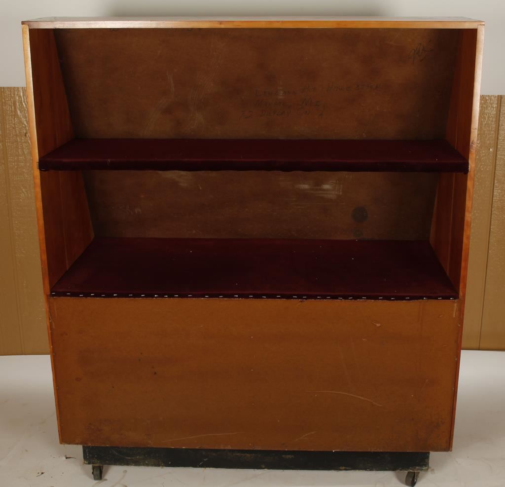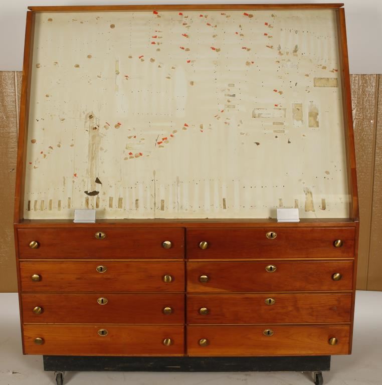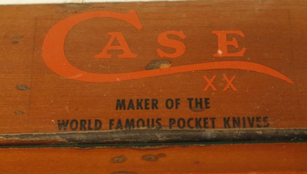 Glass front with 8 drawers that have dividers for pocket knives. One interior shelf that is lined with burgundy velvet. Bottom is also lined with velvet and front section of wood reads "Case XXX Maker of the World Famous Pocket Knives". Brass hardware, measures 56-3/4" x48"x24-1/2". Some dings and scratches on wood and there is a 1" crack in the glass in the lower left corner and a scratch on the right side.