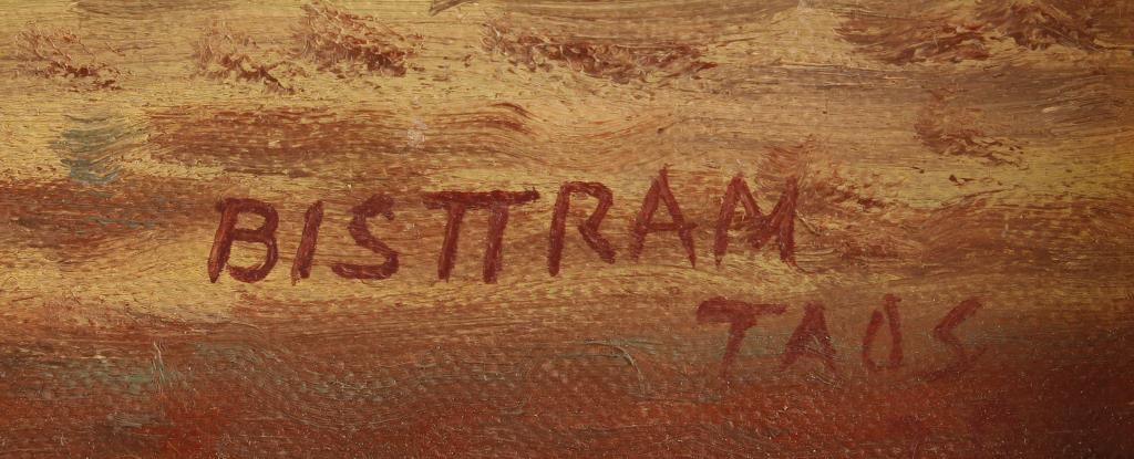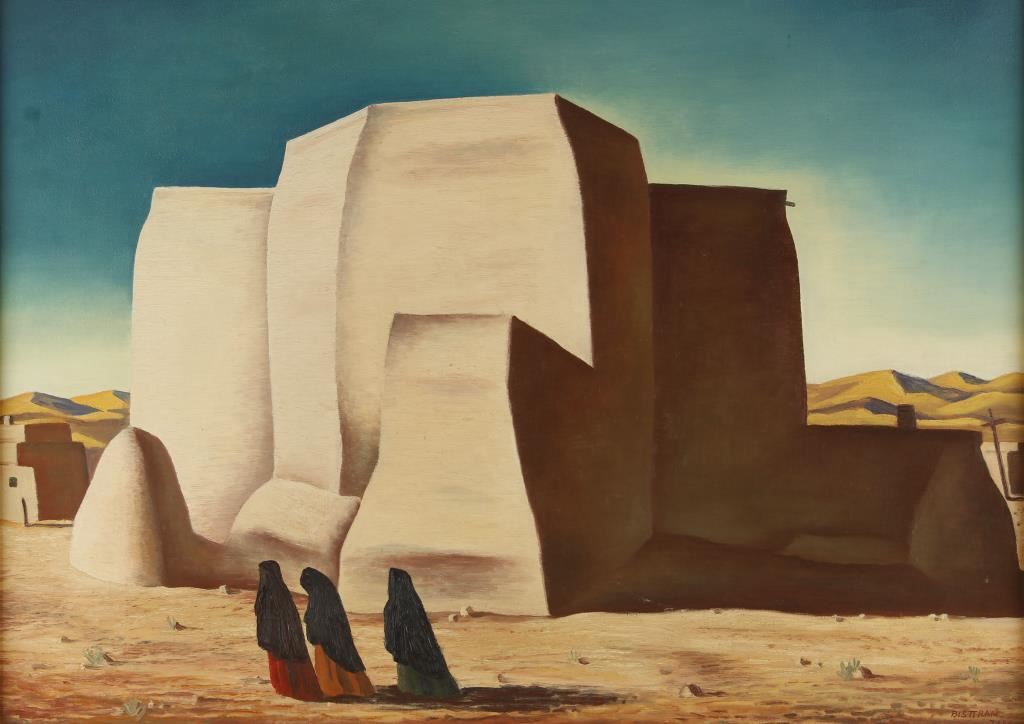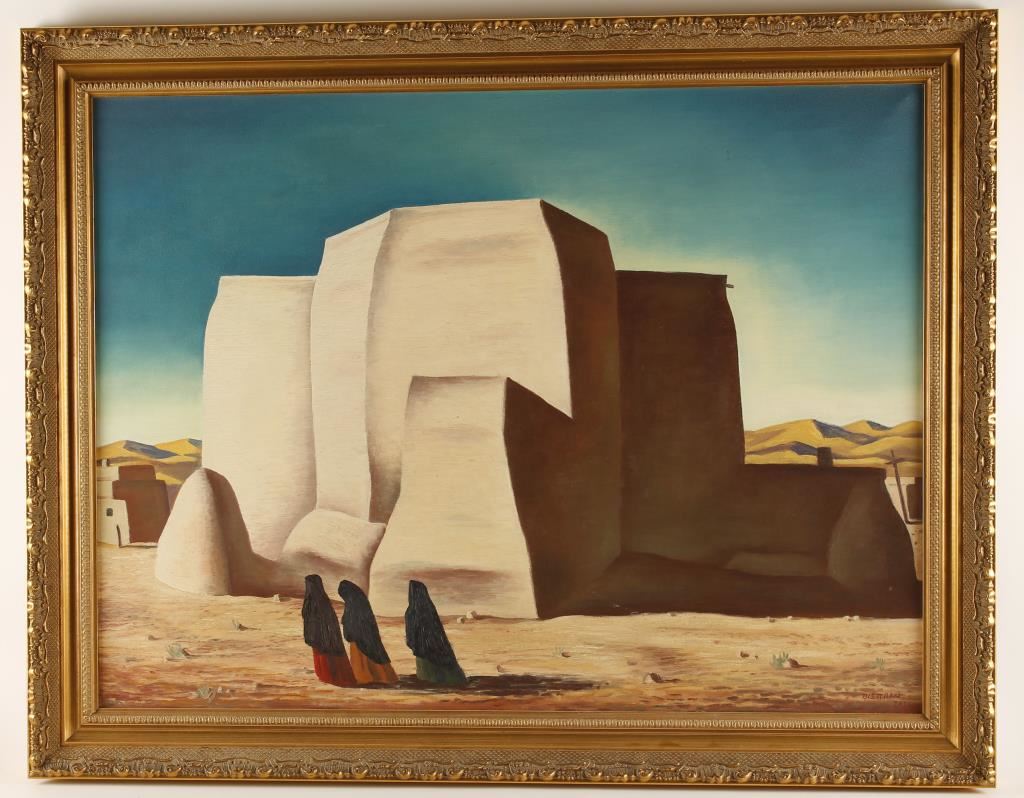 By noted New Mexico Taos artist Emil Bisttram. 36"X27". Signed in lower right hand corner. Entitled Church of the Ranchos. He was born in Hungary, near the Romanian border, in 1895. When he was 11 years old, his family immigrated to New York City. Emil grew up in the tenement buildings that had become the destination for so many Eastern European immigrant families. He was a talented artist, and after a few years began his schooling at the National Academy of Art and Design, then Cooper Union, Parsons, and The Art Student's League. Most of his studies were completed through night courses, as he was working as a commercial artist to support himself. His eagerness to study would translate to a love of and great skill for teaching. He began teaching soon after completing school, first at the New York School of Fine and Applied Arts, and then at the Master Institute of the Roerich Museum. Bisttram first visited Taos during the summer of 1930. He went initially to escape the hardship of life in New York following the stock market crash. His first visit, however, was nearly his last. While enthralled by the beauty of New Mexico, Bisttram was endlessly frustrated by his first attempts at painting there: "Whenever I tried to paint what was before me I was frustrated by the grandeur of the scenery and the limitless space. Above all a strange, almost mystic quality of light." Perhaps frustrated by what may be perceived as his own limitations as an artist, Bisttram returned to New York. If indeed he was frustrated at that time, it couldn't have lasted long, as the very next year he won a Guggenheim fellowship to study mural painting. The fellowship enabled Bisttram to travel to Mexico where he studied mural painting with the world famous muralist Diego Rivera. Numerous mural commissions were to follow throughout his career, including murals for the Department of Justice in Washington D.C., The Taos County Courthouse, New Mexico, and the Federal Courthouse in Roswell, New Mexico. After his time with Rivera was through, Bisttram returned immediately to Taos, and that same year founded the Taos School of Art, of which he would remain the director for the rest of his life. Bisttram came to be much admired as a teacher. He was an extremely articulate individual, and was as skilled at explaining concepts of composition, drawing and painting as he was at applying those concepts to his own paintings. The school was very well attended, particularly during the summer months. Further demonstrating his skills as an administrator, the following year Bisttram started the first commercial art gallery in Taos, the Heptagon Gallery. Bisttram first came to Taos as a representational painter. His canvases show stylized renderings of Native American dancers, portraits of natives and Mexicans, as well as depictions of local architecture. However, he began to experiment with non-objective (ie. Abstract) forms in his paintings. He became heavily influence by the work and philosophy of the painter Wassily Kandinsky. Indeed, in many of Bisttrams canvases, the influence of the Russian is evident in the bright colors, and abstract forms that he began to employ. In 1938 Bisttram, along with Raymond Johnson and several other painters, founded the Transcendental Painting Group in Santa Fe, New Mexico. The aim of the group was to work to bring painting beyond the appearance of the physical world. Work of this type had begun in Europe at least two decades previously, but this was something new to America. Despite the stated goal, Bisttram often maintained elements that were at least semi-representational in his canvases. Bisttram continued to be extremely active in the artistic growth of New Mexico for the rest of his life. In 1952 he co-founded the Taos Art Association, and in '59 won the Grand Prize for painting at the New Mexico State Fair. Also in 1959, a retrospective of his work was held at the Harwood Art Museum in Taos. As a final honor, and tribute to one who done so much for the artistic community and the identity of New Mexico as a whole, in 1975 April 7th was declared "Emil Bisttram Day," a New Mexico state holiday. The next year, 1976, Emil Bisttram died at the age of 81.