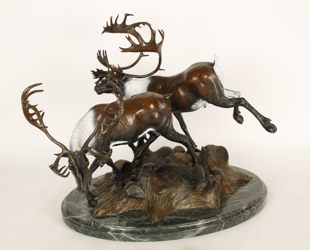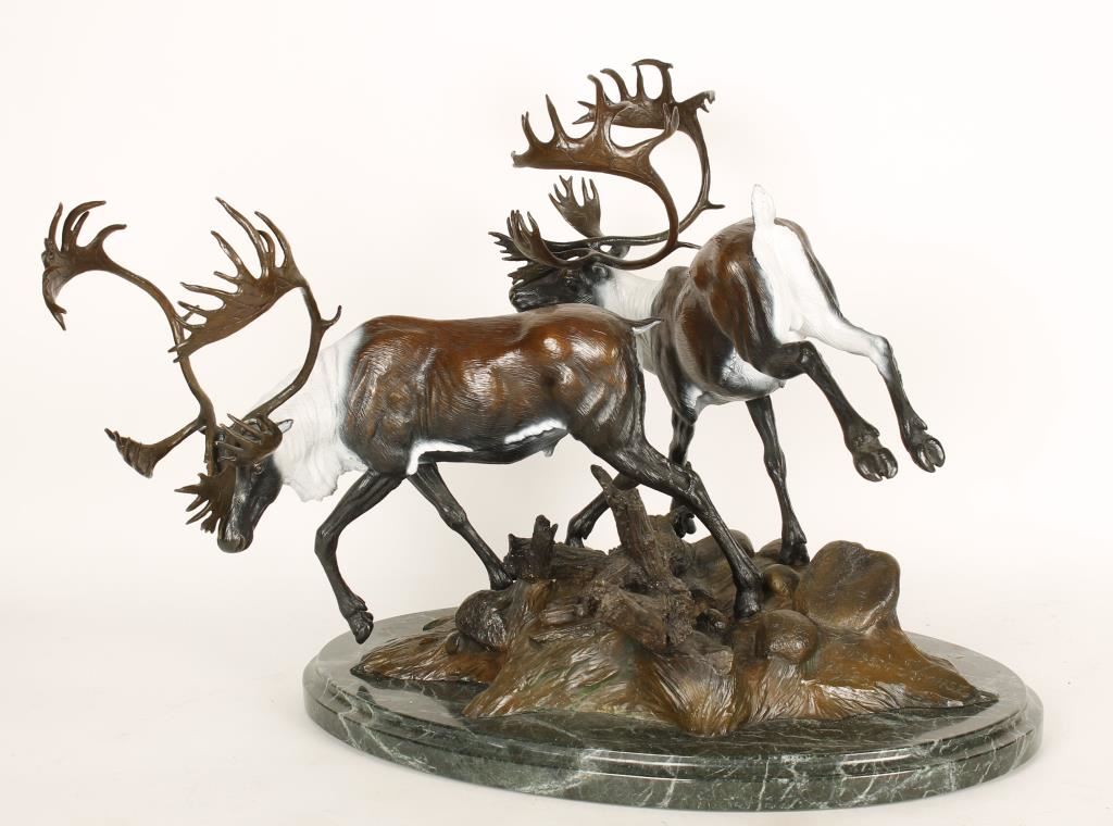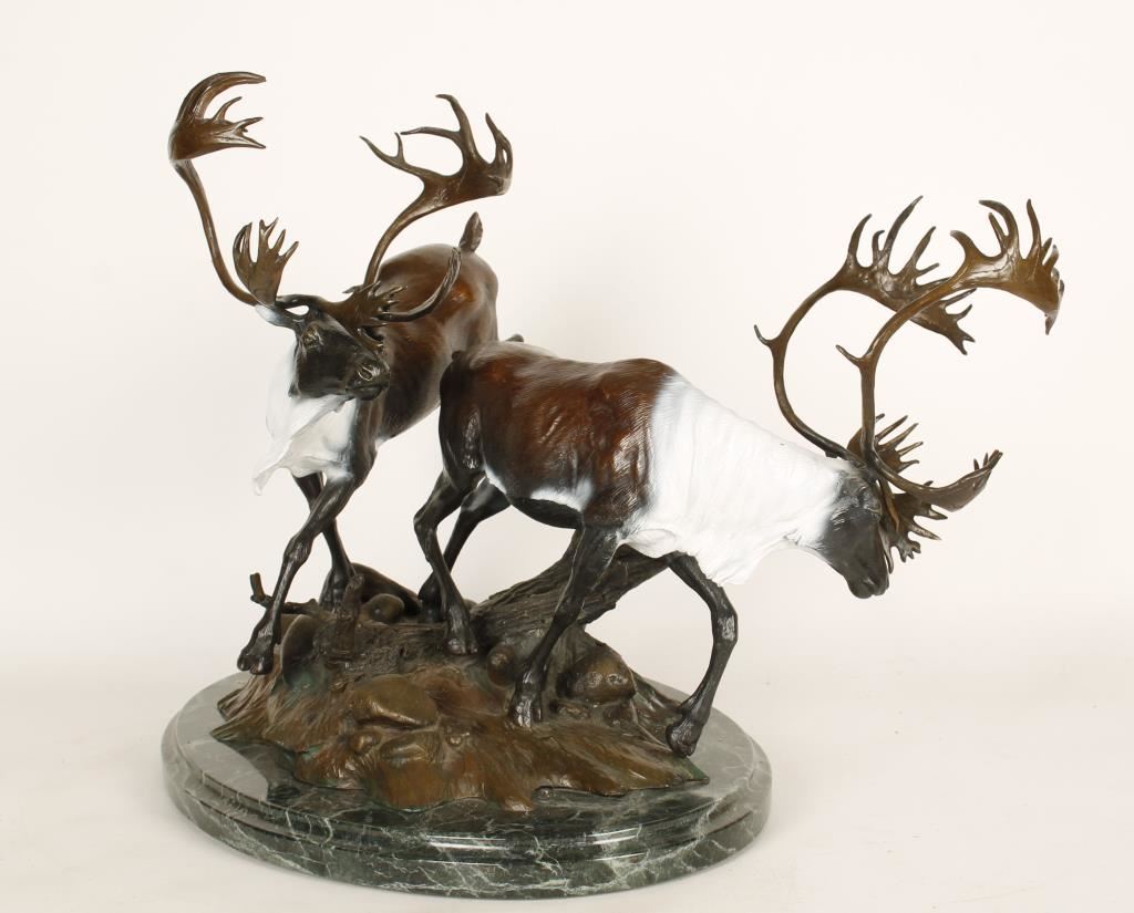 limited edition original bronze #26/26 with a copyright of 1987. Signed on base of bronze. Mixed media colors depicting 2 Caribou males. Measures 20"x17"x15". Bio: Sculptor Joseph Krausz was born in 1936 in Hungary. He traveled to the United States in 1956 and was inspired by the works of Frederic Remington and Charles Russell. Krausz traveled extensively throughout the southwest and studied Native Americans, their culture and the wildlife of the region. His bronze sculptures are in many western art collections. Source: Morris & Whiteside Galleries, October 2003.