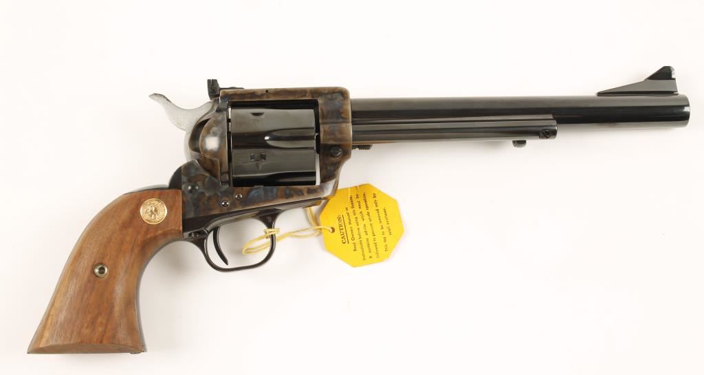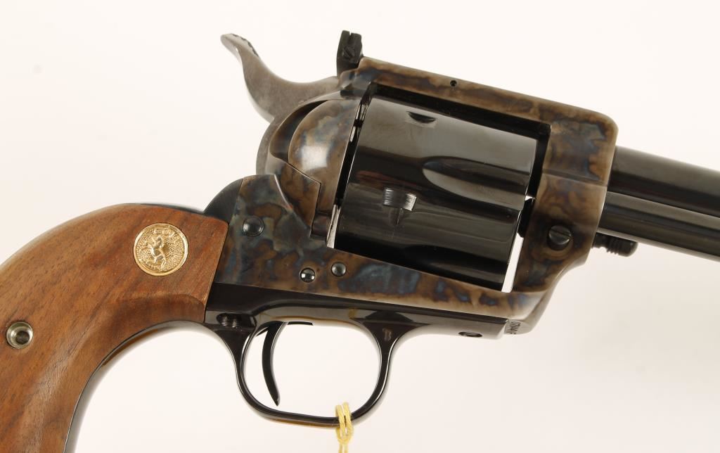 Blued and case-colored single-action 6-shot revolver with a 7-1/2" barrel, adjustable rear sight, smooth wood medallion grips, Styrofoam factory packing, wood-grain sleeve with documents and sales receipt from July of 2000. Made in 1978 or 1980. Metal finish shows some dings on the edge of the flat-top but otherwise impeccable. Wood grips are unblemished. Bore is mirror bright with sharp rifling. Chambers are pristine. Cylinder shows no drag line so action not checked. Condition is excellent. *Modern Firearm*