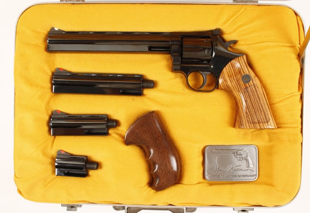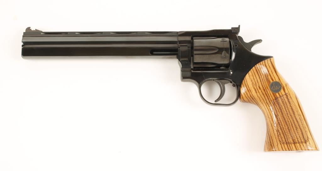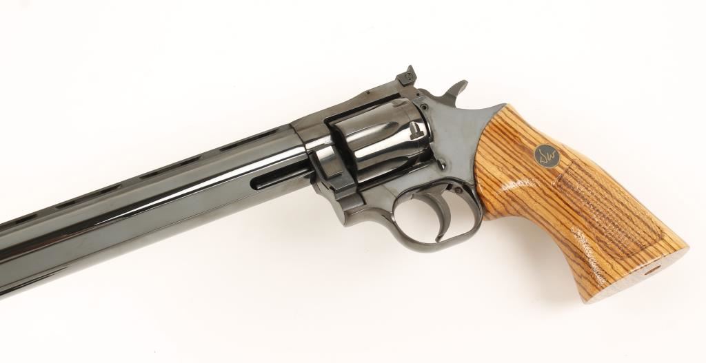 Blued double-action 6-shot revolver with adjustable rear sight, 2-1/2", 4", 6"and 8" barrels and vent-rib shrouds, tools, alternate grip, 4 extra front sight blades, patch, belt buckle, documents and locking case with no key. Metal finish has a drag line, a small ding by the hammer and a scratch on the right side. Bores are bright and shiny with some machining marks. Action is smooth with very good lock-up. One piece wood grips are pristine. Condition is excellent. *Modern Firearm*