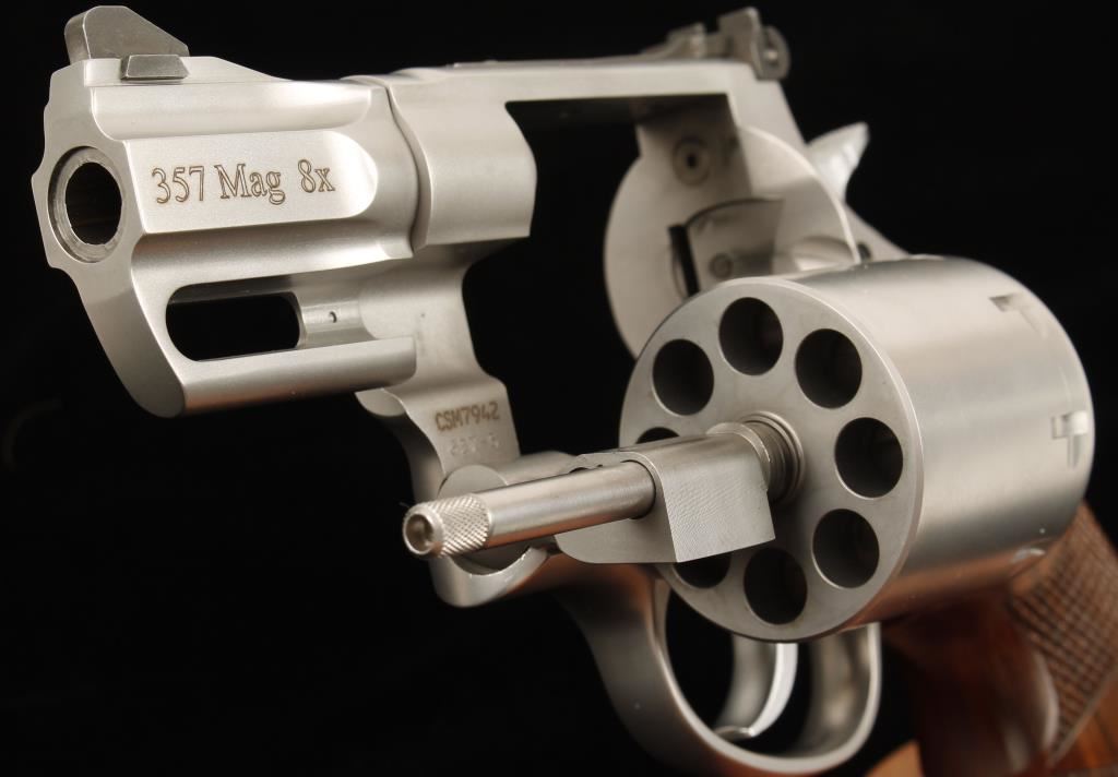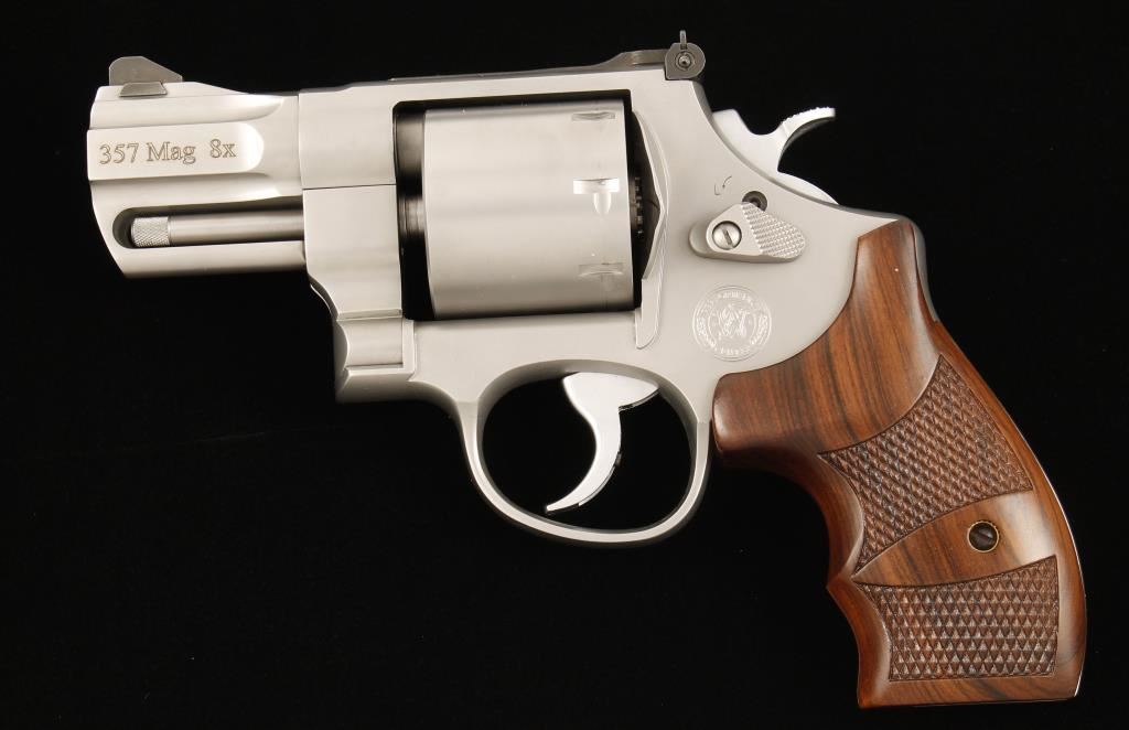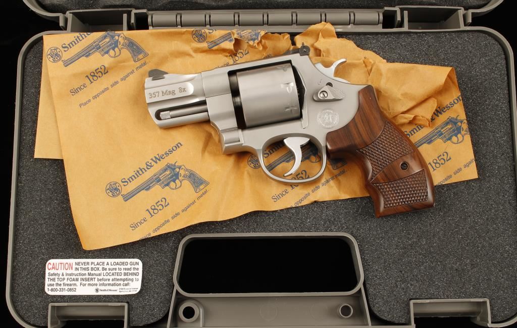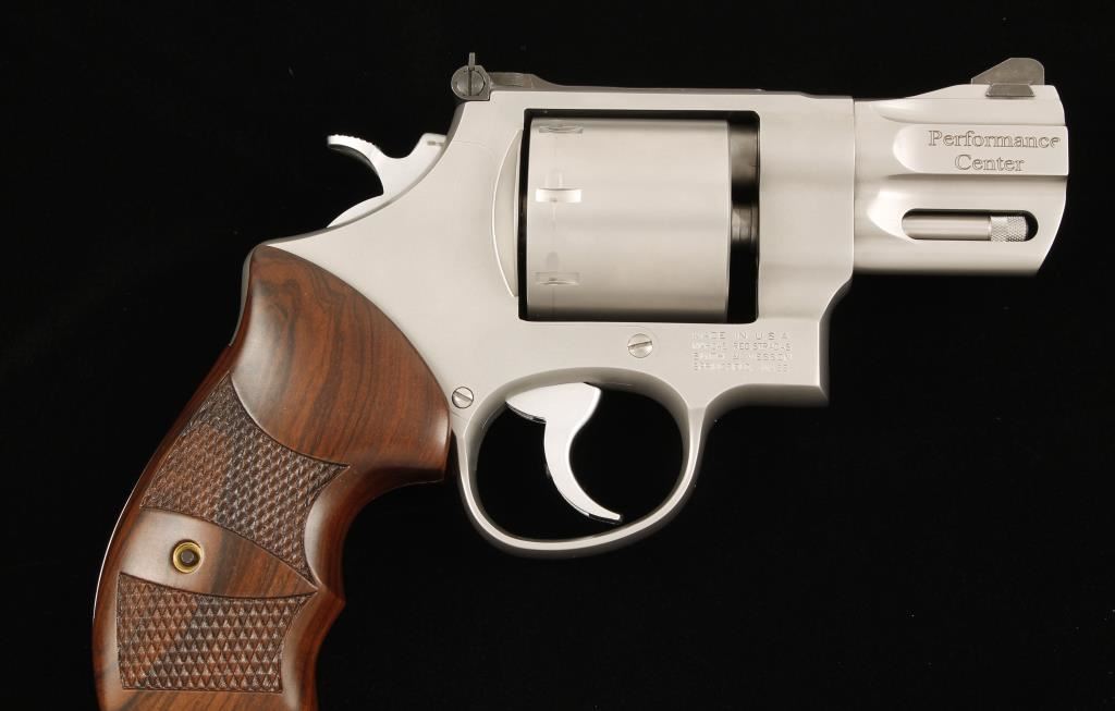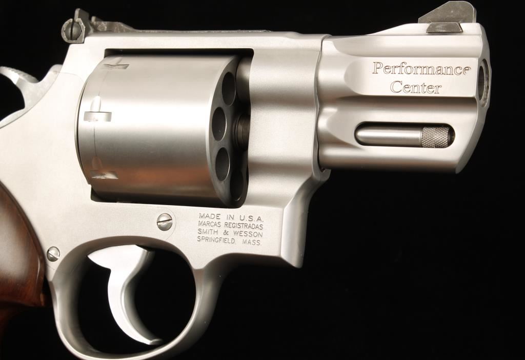 Performance Center satin stainless finished eight-shot double action revolver chambered in .357 Magnum. Features a 2 5/8" tapered and contoured barrel, ramped front sight with red insert, adjustable micrometer click rear sight, full barrel lug, non-fluted cylinder, smooth trigger, checkered hammer spur, internal key lock and deluxe checkered wood grips. Includes original case, papers, moon clips and keys. Finish shows very little wear other than a drag line. Bore is excellent as is the action. Condition is excellent in box. ***Modern Firearm***