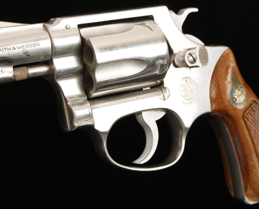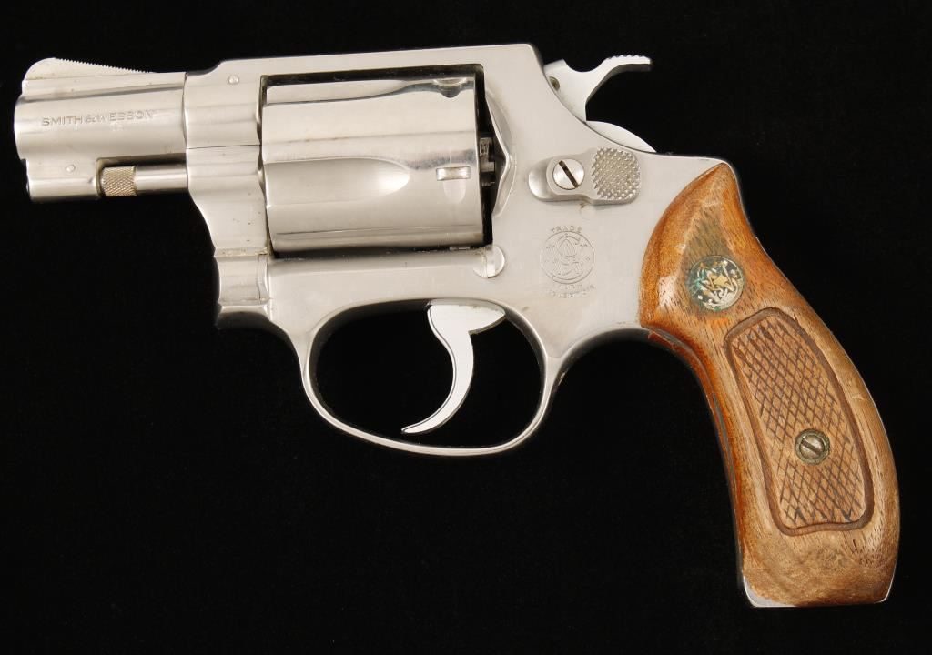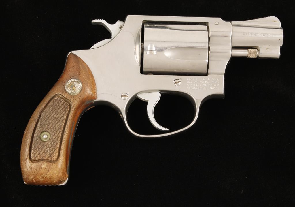 Stainless steel 5-shot double-action revolver with a 1-7/8" barrel, fixed sights and checkered wood grips. Metal finish is dull with a drag line, some scratches and rubs. Bore is shiny with sharp rifling. Chambers are shiny. Wood round-butt grips are worn with the left grip front corner having been worn form the checkered area down to the frame corner. There are many small dings and the checkering is almost smooth in spots. Action is good and the lock-up is almost rock solid. Condition is good. *Modern Firearm*