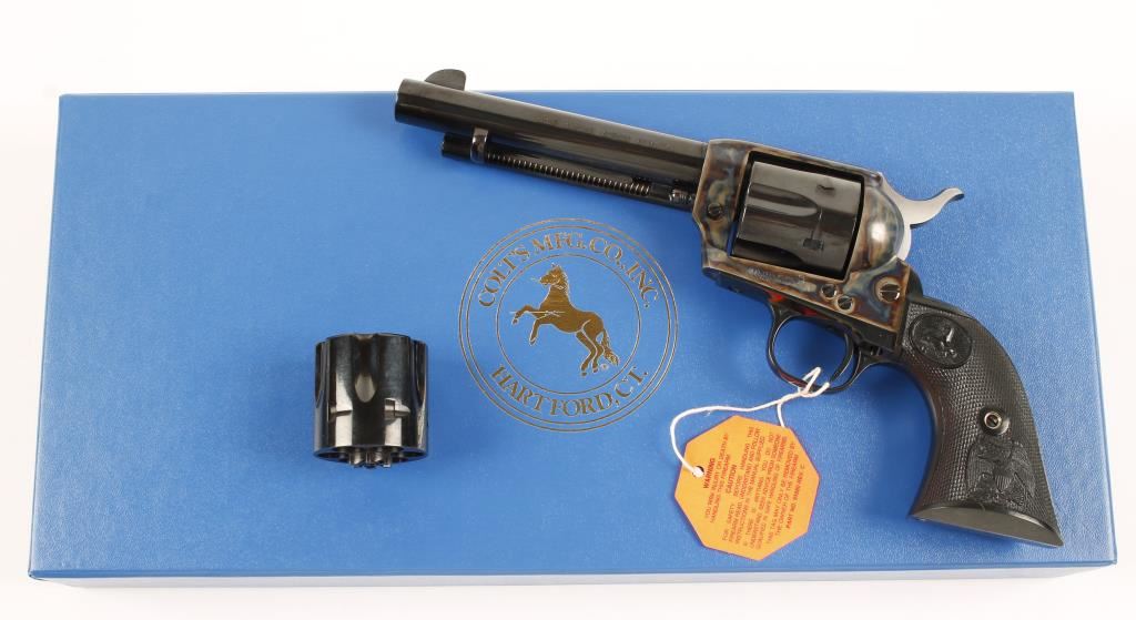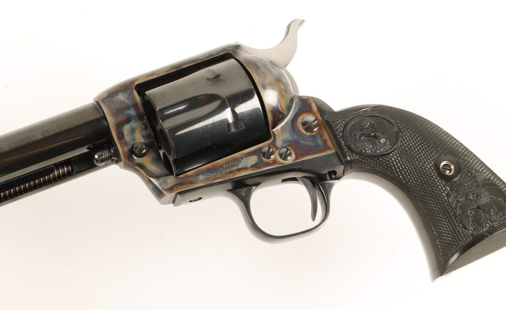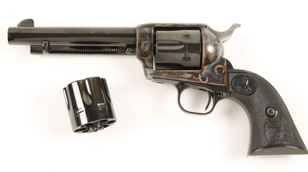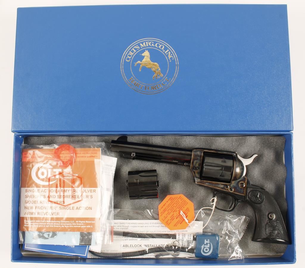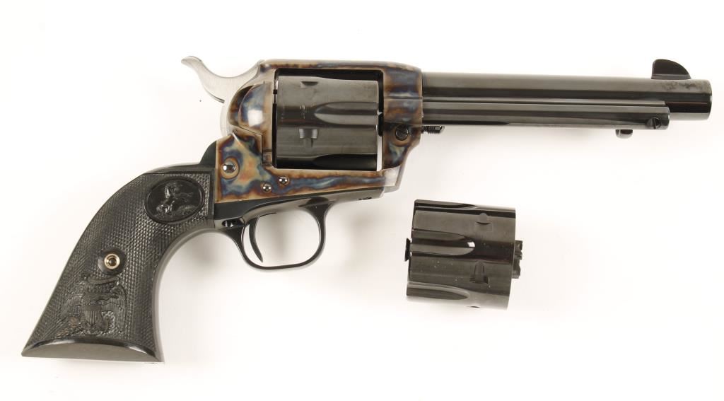 SN:S40481ABlued and case-colored single-action 6-shot revolver with a 5-1/2" barrel, checkered black plastic grips, second factory fitted cylinder (also numbered to the gun), blue factory box with shipping sleeve, lock and documents. Made in 2005. Metal finish show scuffs on installed (.45ACP) cylinder. Bore is mirror bright with sharp rifling. All chambers are immaculate. Color case-hardening has a few tiny scratches and scuffs. Grips are flawless. Action is faultless with good lock-up. Condition is excellent. *Modern Firearm*