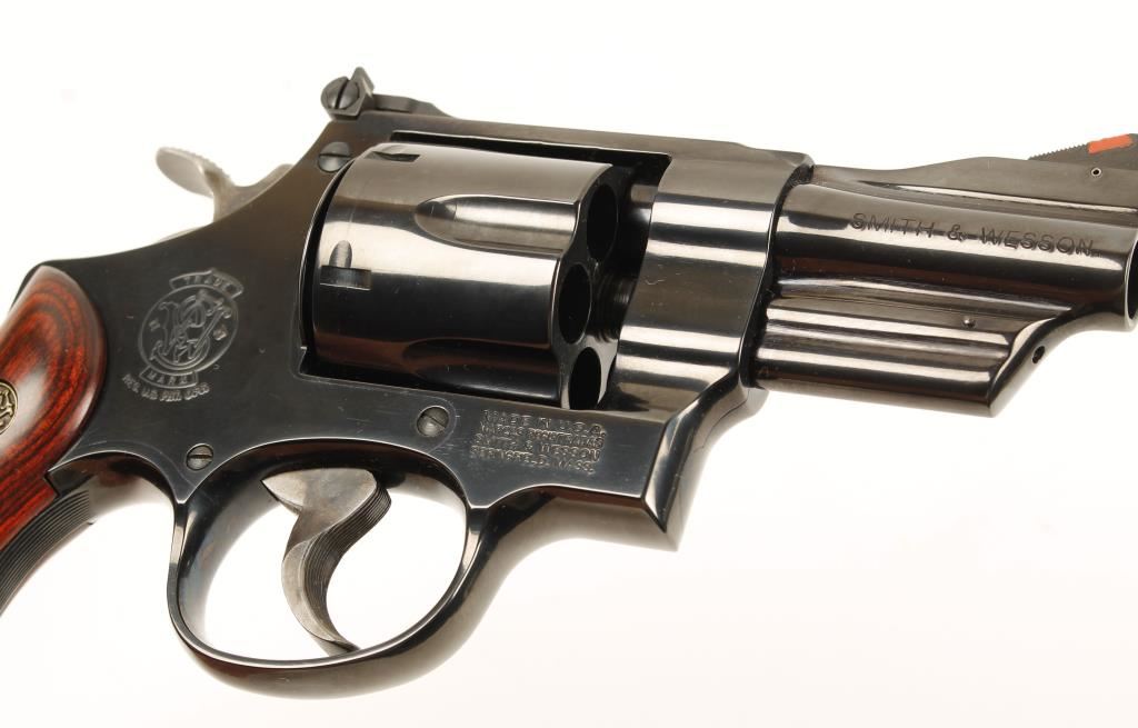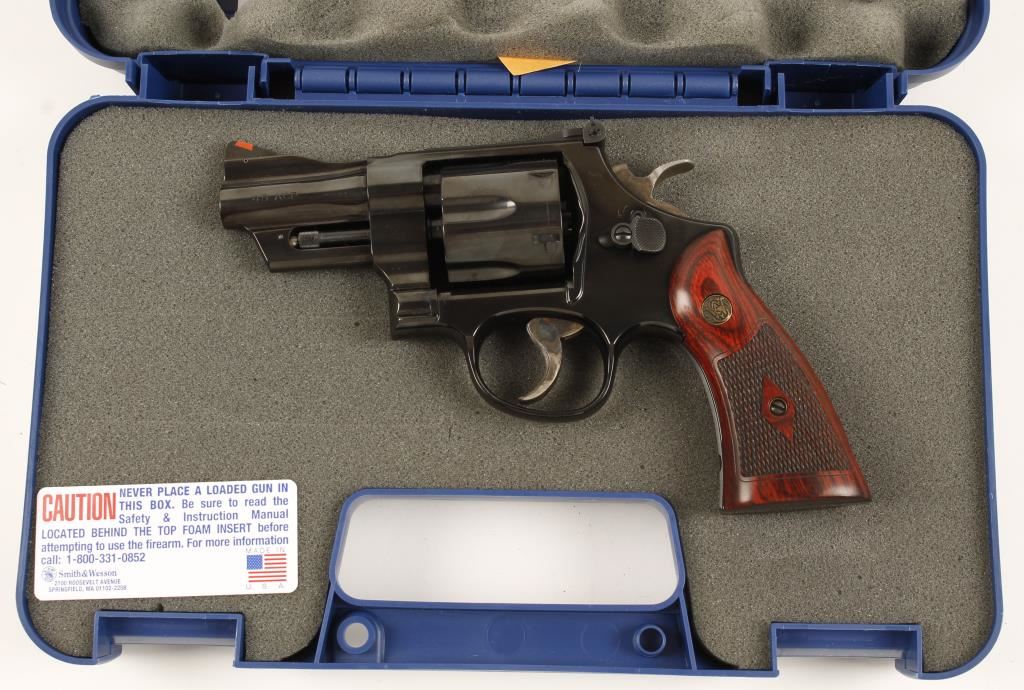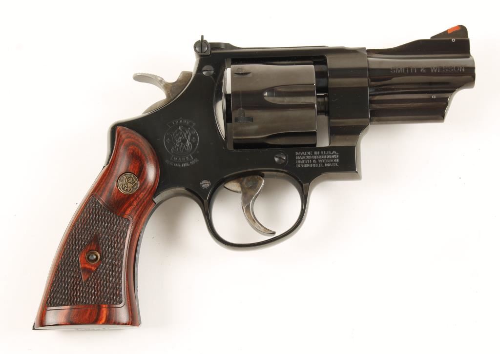 Blued six-shot double action revolver chambered in .45 Automatic Colt Pistol. 1 of 250 Limited edition Lew Horton revolvers Product number 150124. Features a 3" barrel, ramped front sight, adjustable micrometer click rear sight, serrated target trigger, target hammer with checkered spur, fluted cylinder, serrated front & backstrap, internal key lock and checkered medallion diamond Rosewood grips. Includes original case, papers, moon clips and keys. Finish has only very little handling wear and a faint drag line. Bore is excellent as is the action. Condition is excellent in box. ***Modern Firearm***