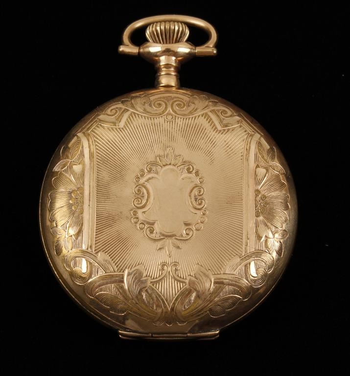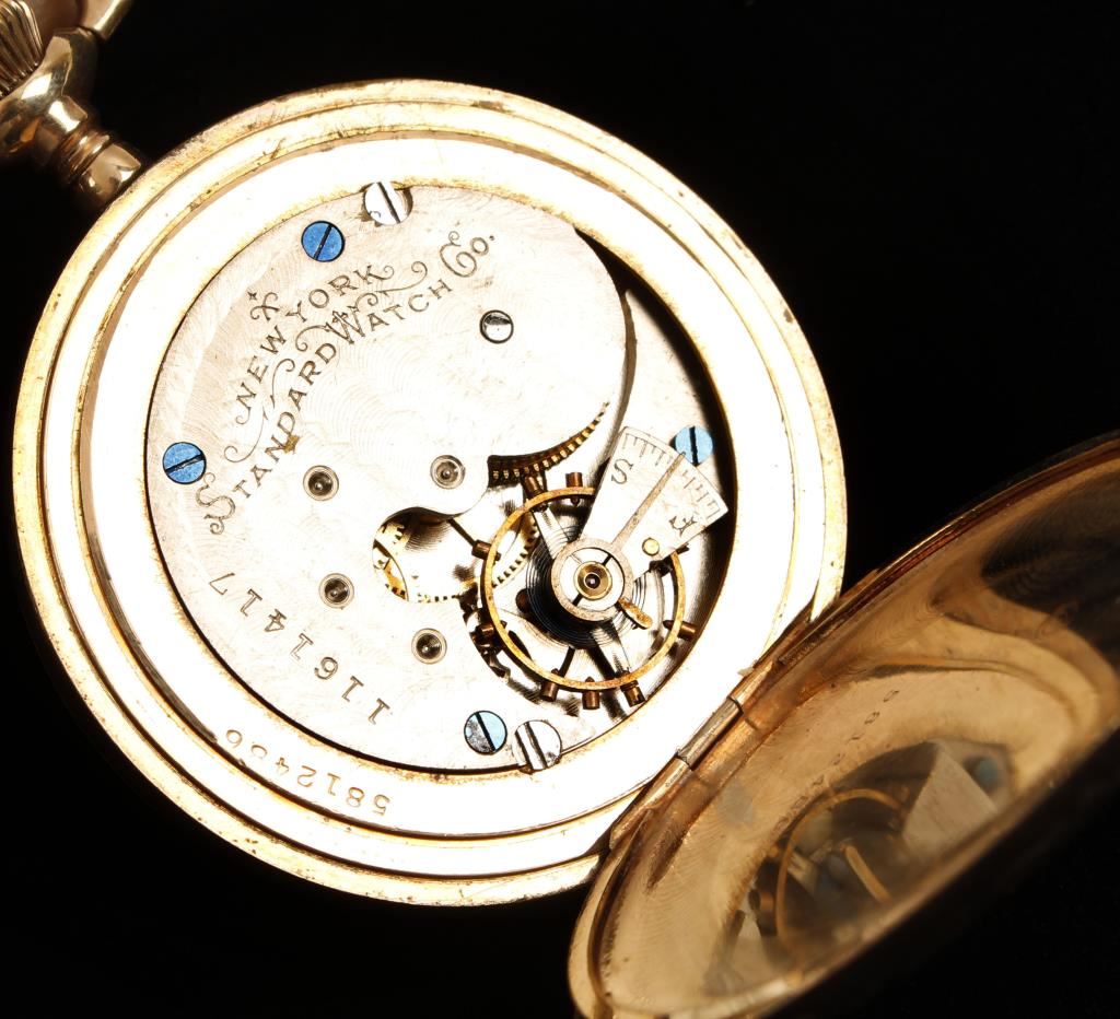 New York Watch Co, with porcelain face. Serial #1161417. Very good condition, working. Engraved case with floral shield motif.