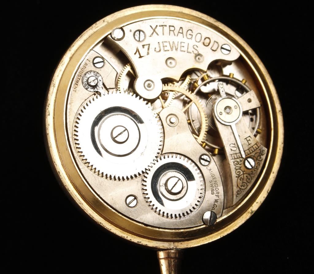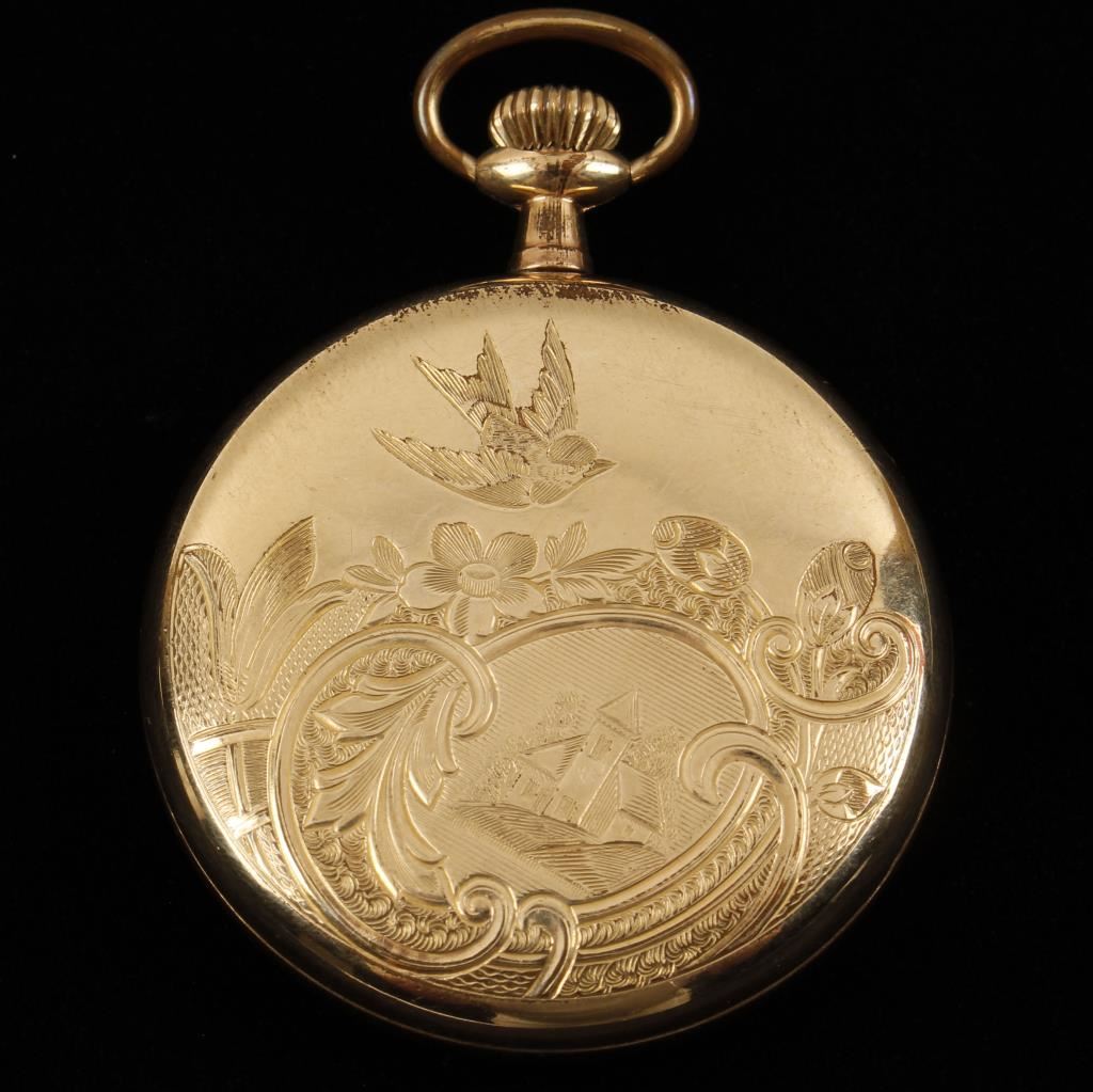 From Langendorf Swiss with porcelain face which shows a little wear to edges. Engraved case with farm scene and sparrow motif. 17 jewel, in working condition overall very good.
