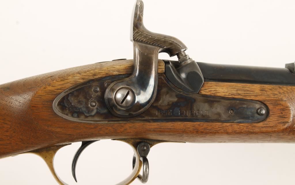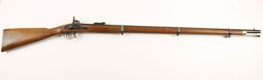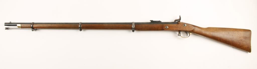 Blued, case-colored and brass black powder cap-and-ball rifle with a 39" barrel and walnut stock. Adjustable rear ladder sight missing the slider. Two sling swivels. Blued barrel has wear at the muzzle and bayonet locking area with scratches in areas along the top of the barrel. The bore is shiny with good rifling. Case colored barrel bands, lock plate and hammer all have good colors with few scratches and dings. Lock plate has "1853 Enfield" and a crown stamped on it. Brass forend cap and trigger guard have few scratches and tiny dings. The brass buttplate has many scratches and dings. Brass washers for the lockplate screws are tarnished. The heads of the lockplate screws are worn with evidence of having been turned. Wood condition is good with small dings, dents and scratches but nice figure in the belly of the butt. Action works well. Includes ramrod. Condition is very good. *Antique Firearm*