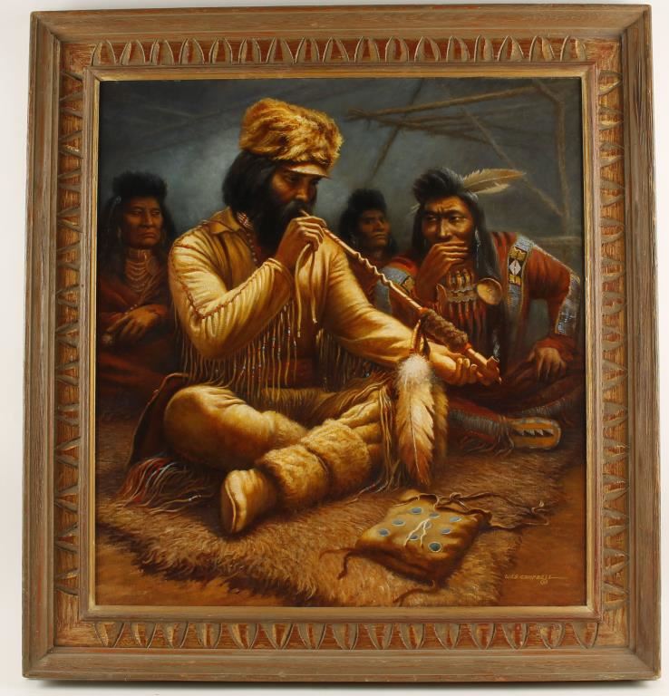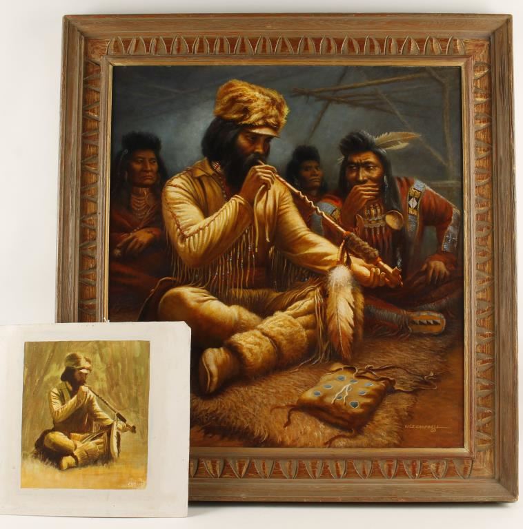 Entitled "Suspicions" dated 1975. Hand signed lower right hand corner. Depicting mountain man smoking peace pipe with Indian elders. Image measures 23 1/2"x26". Includes the original sketch the artist composed as a rough draft for the painting. In wood frame.