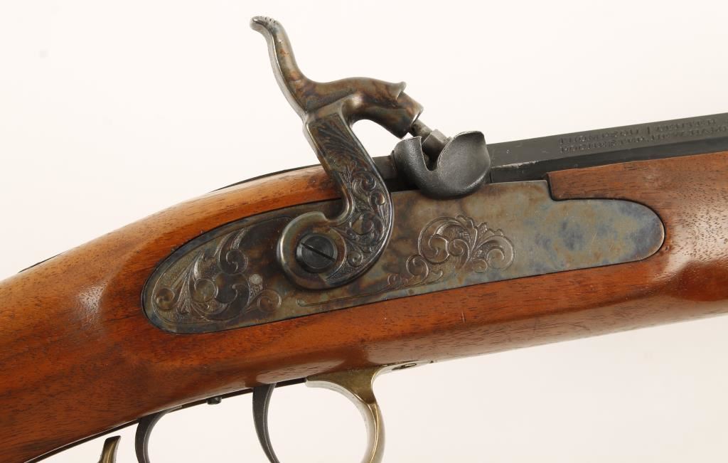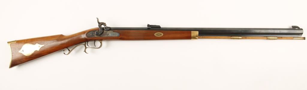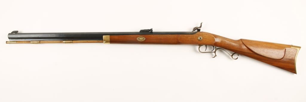 Blued and case-colored steel, brass and walnut black powder rifle with a 28" octagon barrel and double set triggers. Blued barrel has finish wear near the nipple, a few scratches and an adjustable rear sight (loose) with front bead sight. Bore is dirty with deep rifling. Brass thimbles, ramrod end, forend cap, wedge hardware, trigger guard, patch box, lockplate washer and buttplate are all tarnished but have few scratches. Case-colored lockplate and hammer still have bright colors. Walnut stock has a cheekrest for a right-hander and many rubs and dings but no chips or cracks. Action works well. Condition is good to very good. *Antique Firearm*