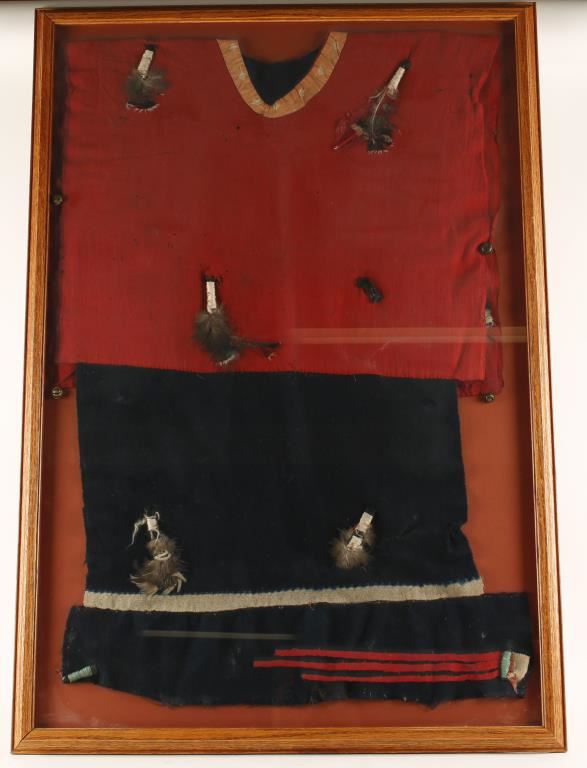 Feather tassels on wool trade cloth in red and blue. Circa 1890-1910, nicely framed.