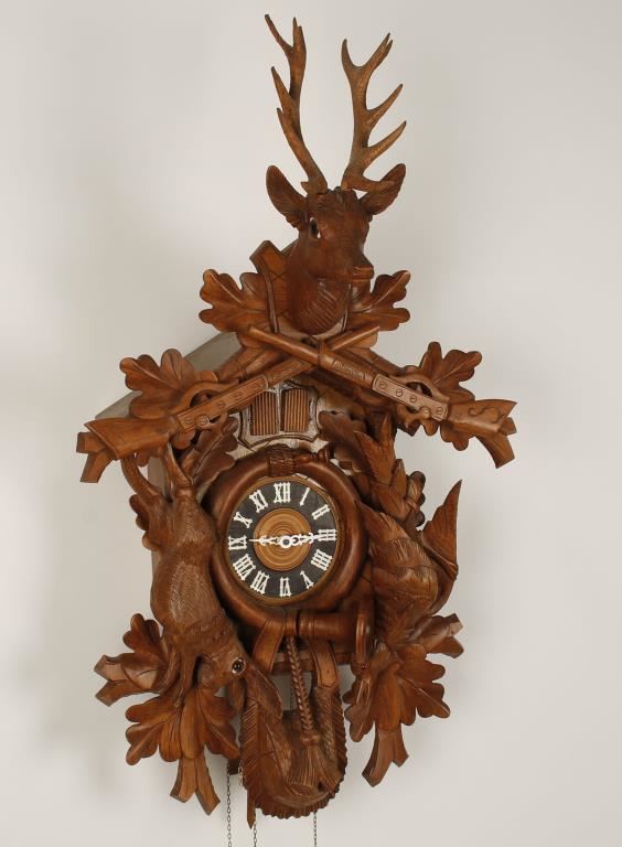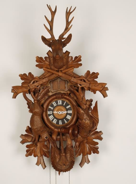 Large elk and accented with rifles, rabbit and pheasant. Two door design. All original condition. Swiss musical movement "Cuendet" on back of clock. Excellent overall working condition.