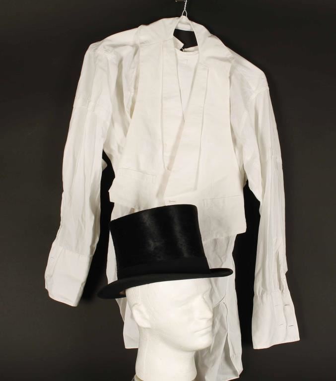 Black beaver skin top hat size 7 1/2. Good condition, some wear around edges and small spot on underside of brim. Arrow Co. white shirt and matching Higgins & Frank white vest. Appears to be a men's Large.