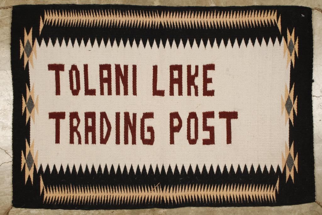 Reads "Tolani Lake Trading Post" in burgundy with black and tan geometric border. Measures