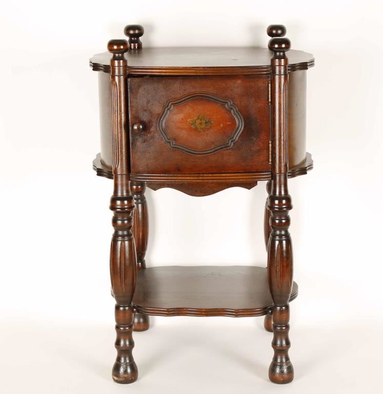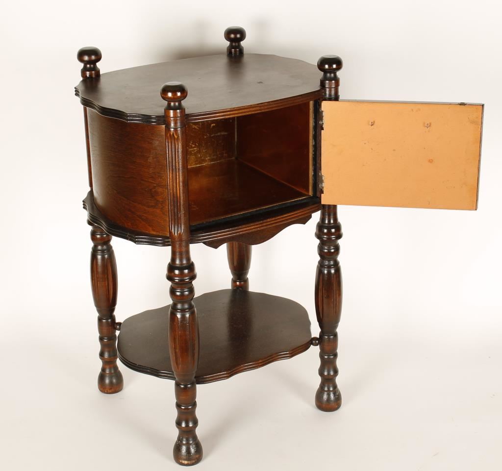 Four ball and scroll columns hold a copper lined cabinet. The door has a petite flower motif inside a carved oval design with a wooden knob. One lower shelf for storage. Shows age and use otherwise good condition. Measures 25 1/2"x16 1/2"x12 3/4". Perfect for the reserved gentleman's office or bar!