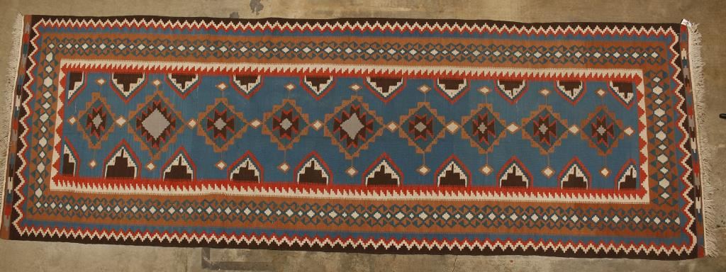 Blue, brown and green. Measures 3.2'x9.7'. Fair condition.