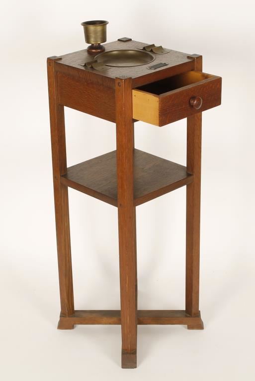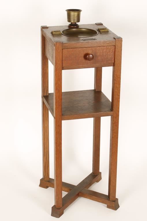 Oak base holds a brass ashtray, two cigarette holders and a cup to hold a cigar. One drawer with a wood knob and a lower shelf for storage with an X design at the base. A few dings and scratches otherwise good condition. Measures 24"x8 1/2"x8 1/2".