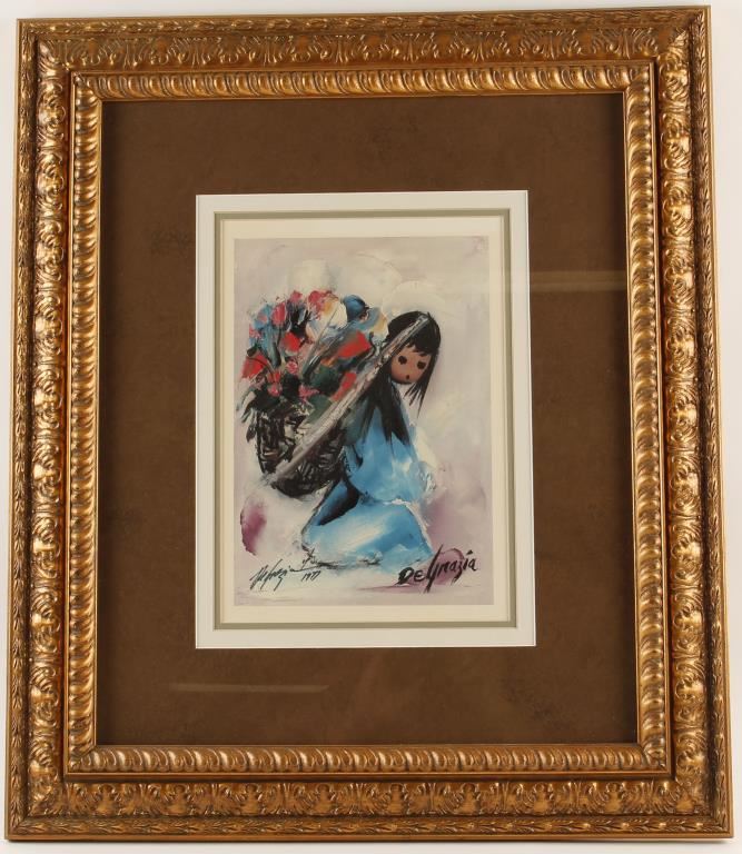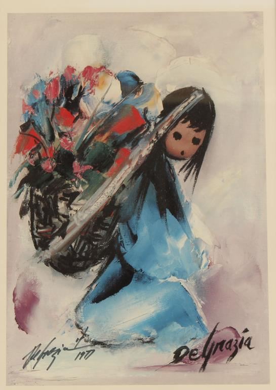 By noted Arizona artist De Grazia entitled "Flower Girl" hand signed by the artist and dated 1977. Triple mat in gold frame, image size 9 1/2x13 1/2".
