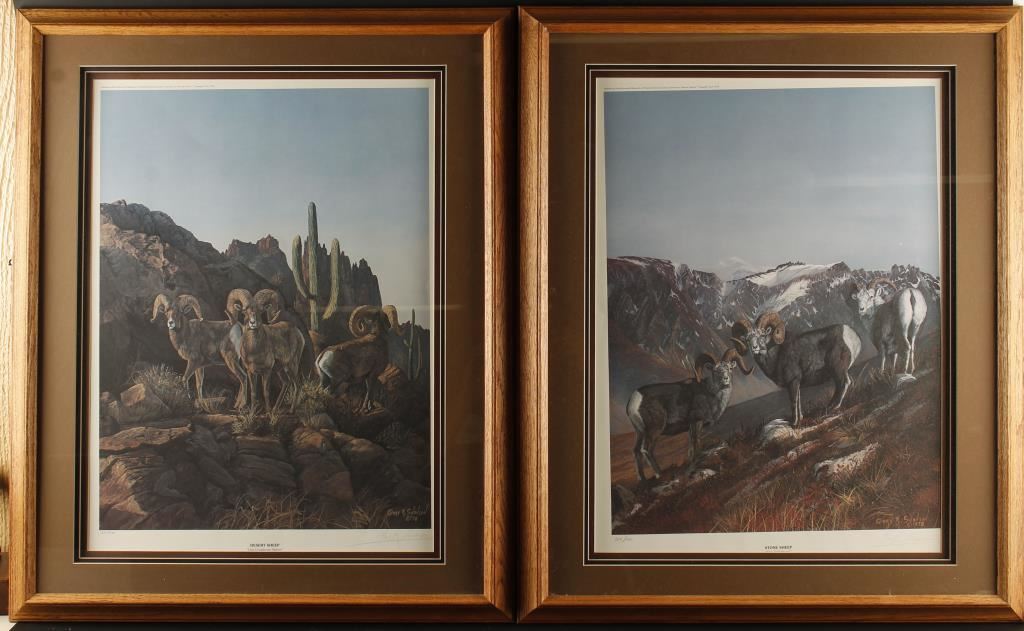 Noted wildlife artist. Titled 'Desert Sheep' and 'Stone Sheep'. Both are numbered 325/450 Published by the Rocky Mountain Editions Inc. of Prescott, AZ. Triple mats in honey oak frames. Image size 26"x16". Hand signed on print in pencil in lower right hand corner.