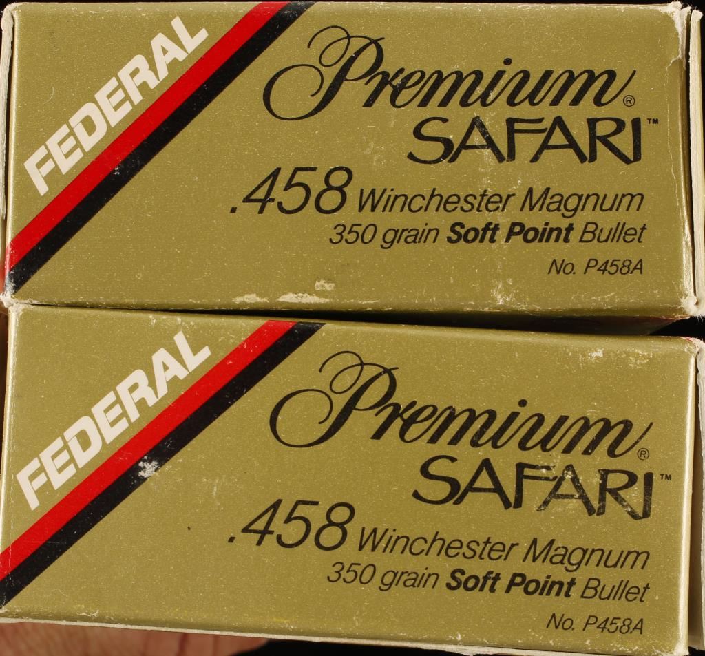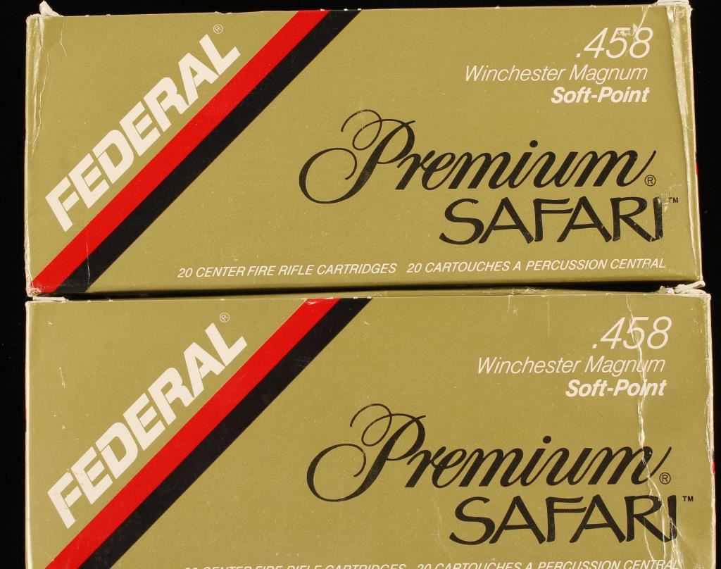 Two boxes of Federal Premium Safari .458 Winchester Magnum 350 grain Soft Point bullets.