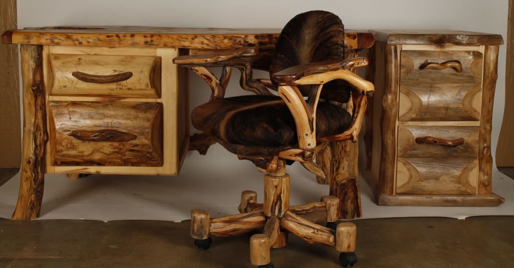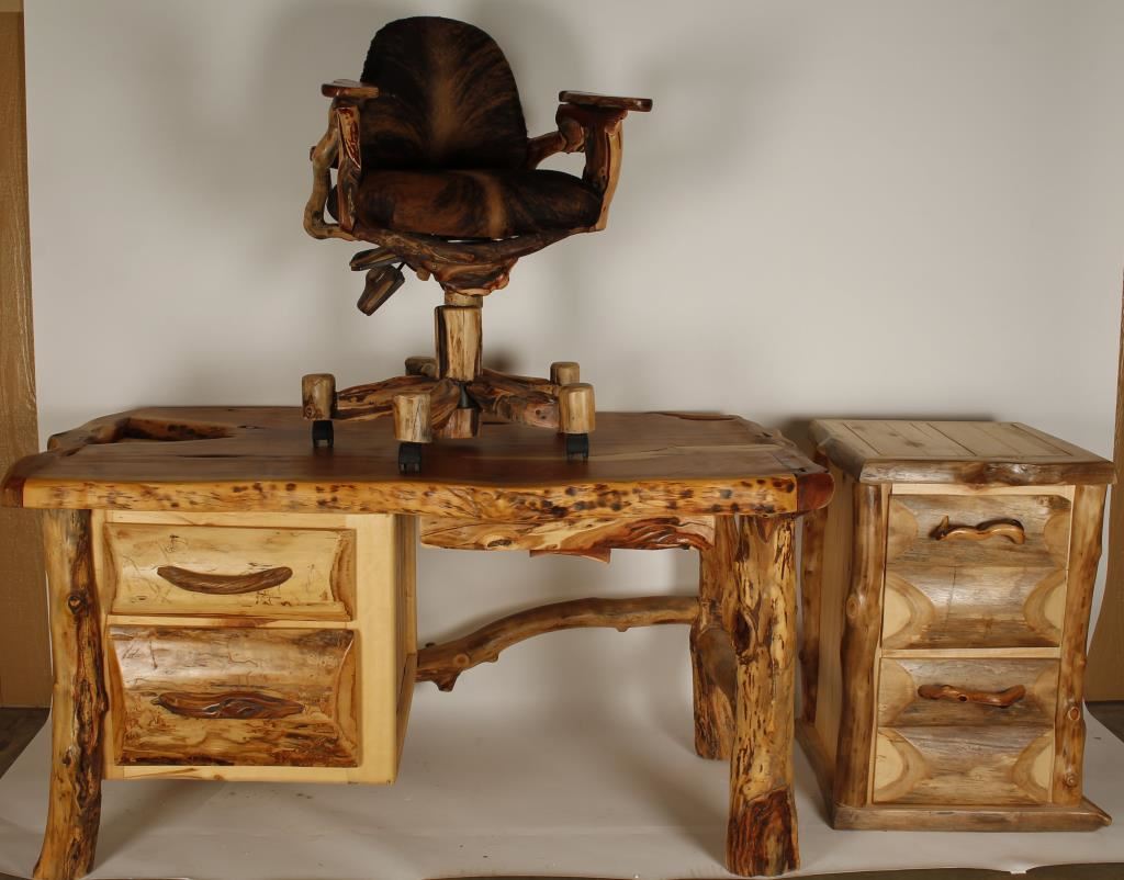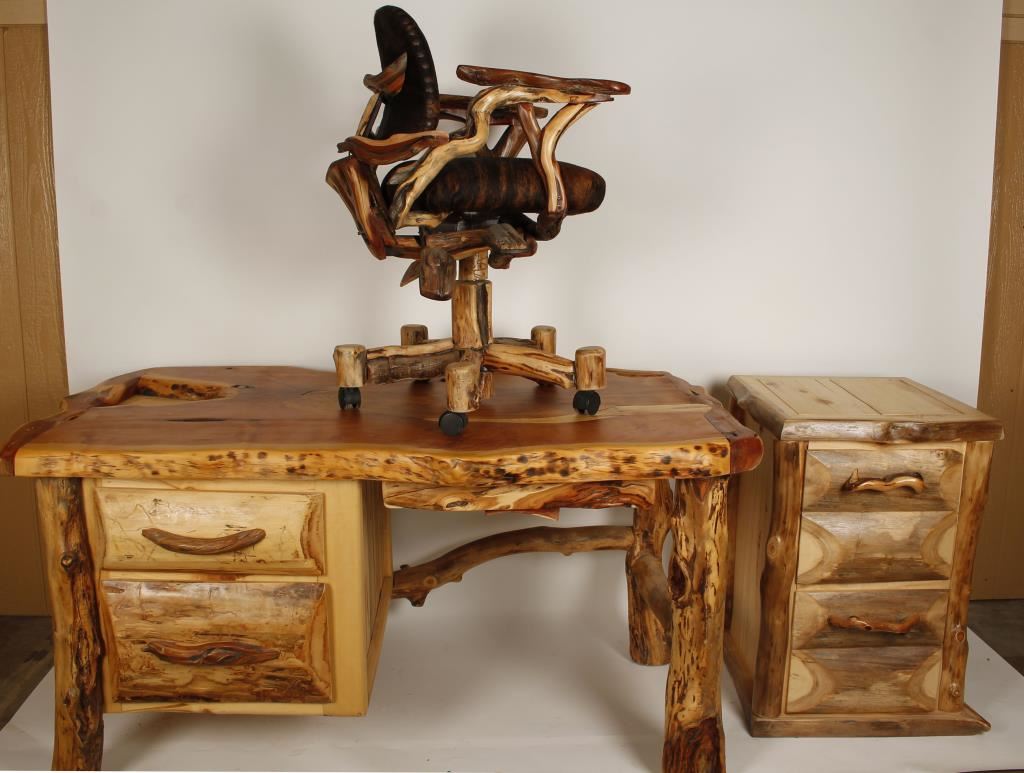 Lot 834 Rustic Aspen Wood Desk, Office Chair