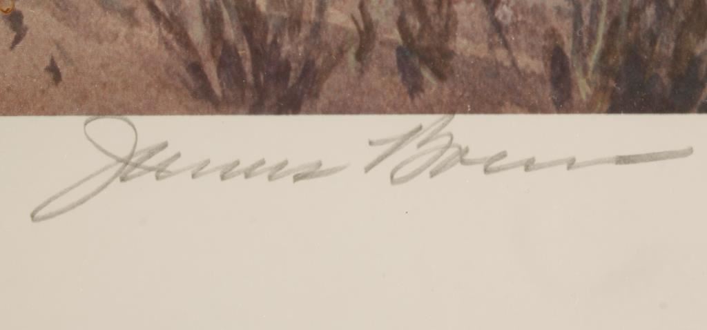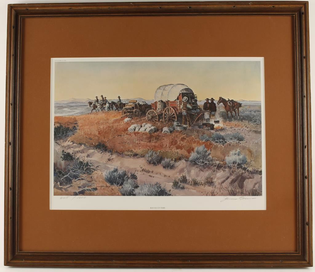 by James Doran Cowboy Artist. "Roundup Time" hand signed in pencil lower right hand corner limited edition 645/1000. 19"x13 1/2" image size with brown mat and wood frame.