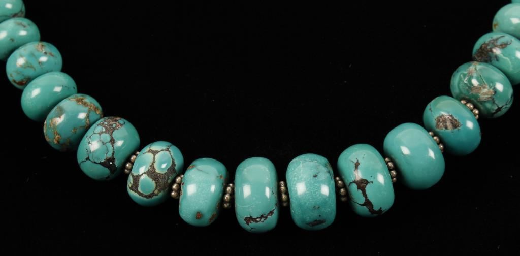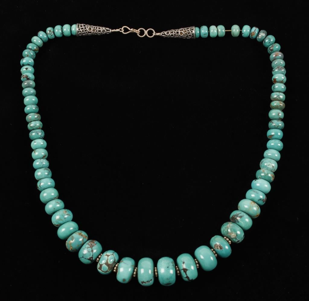 Beautiful green color in a graduated design from small to large. Cube shape turquoise beads intermixed with purple opalescent glass bead. Beautiful consistent color. From the Charlie Myers estate noted dealer, collector and friend.