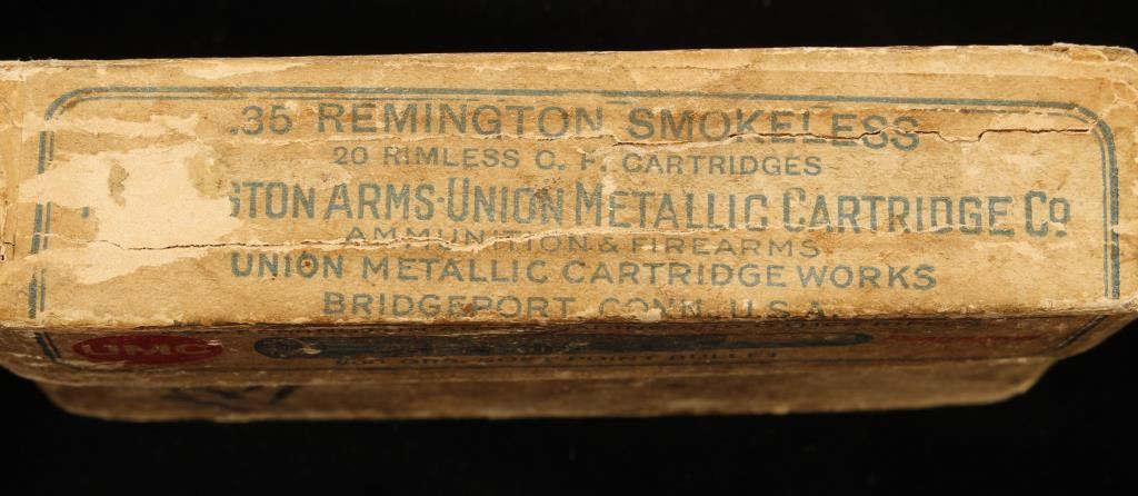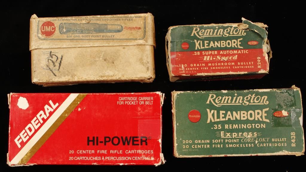 Some collectible. Full boxes with factory loads: Federal 30-30 Winchester (1 box, 20 rounds) and Remington Kleanbore .38 Super (1 deteriorating box in a bag, no round count). Reloads: Remington-UMC .35 Remington (1 box. 20 rounds with headstamps from Rem-UMC, R-P, and WRA Co.) and Remington Kleanbore .35 Remington (1 box. 20 rounds with headstamps from R-P, Rem-UMC, Super-X).