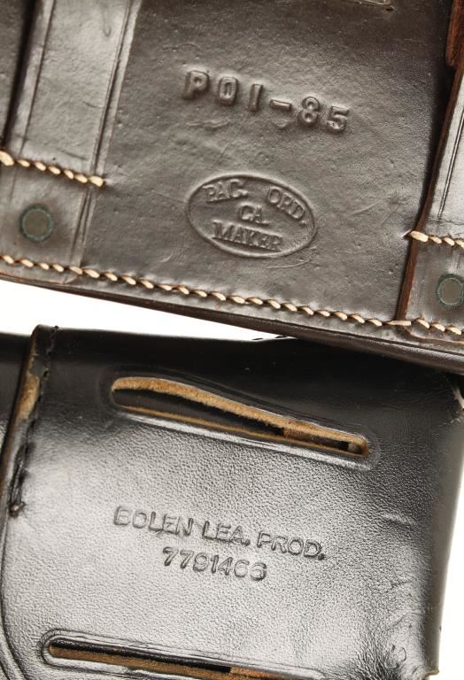 Black leather 1911 holster made by Bolen Leather. Brown leather reproduction of a McKeever cartridge box made by Pacific Ordnance of California. Made to fit 20 rounds of 30-40 Krag. Brown leather belt with possibly WWI vintage 2-piece brass buckle as found on Mills belts from that period.