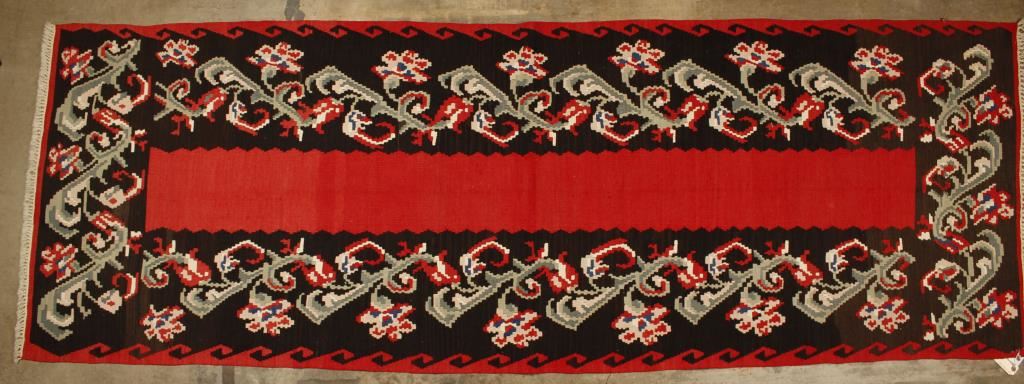 Red, black and green. Measures 3.8'x9'. Fair to good condition.