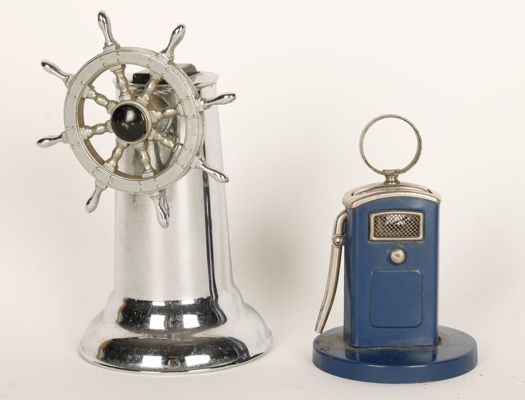 Both metal construction. 1 Old fashioned blue gas pump, measures 3 3/4" tall, and 1 silver metal ship's wheel lighter measures 5 1/4" high.