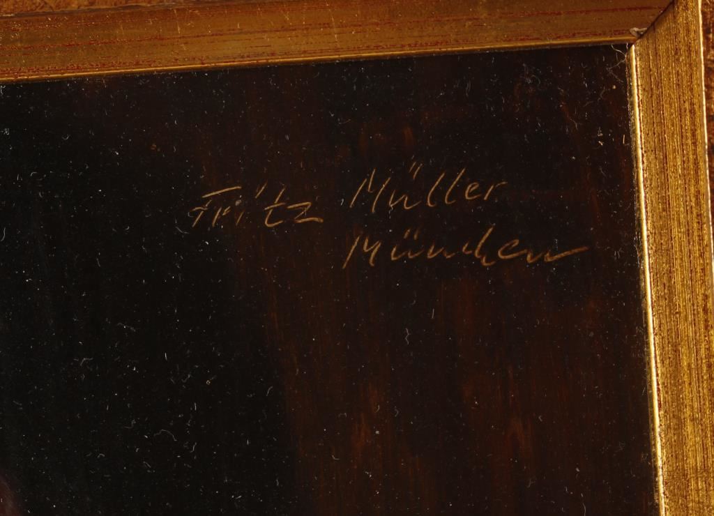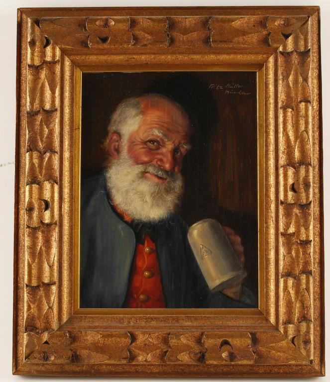 by noted German artist Fritz Muller. Depicting a German gentleman with a pint, signed upper right hand corner. 9.5X6.5. In Gold frame. From the estate of John Knoblauch noted Western art collector.