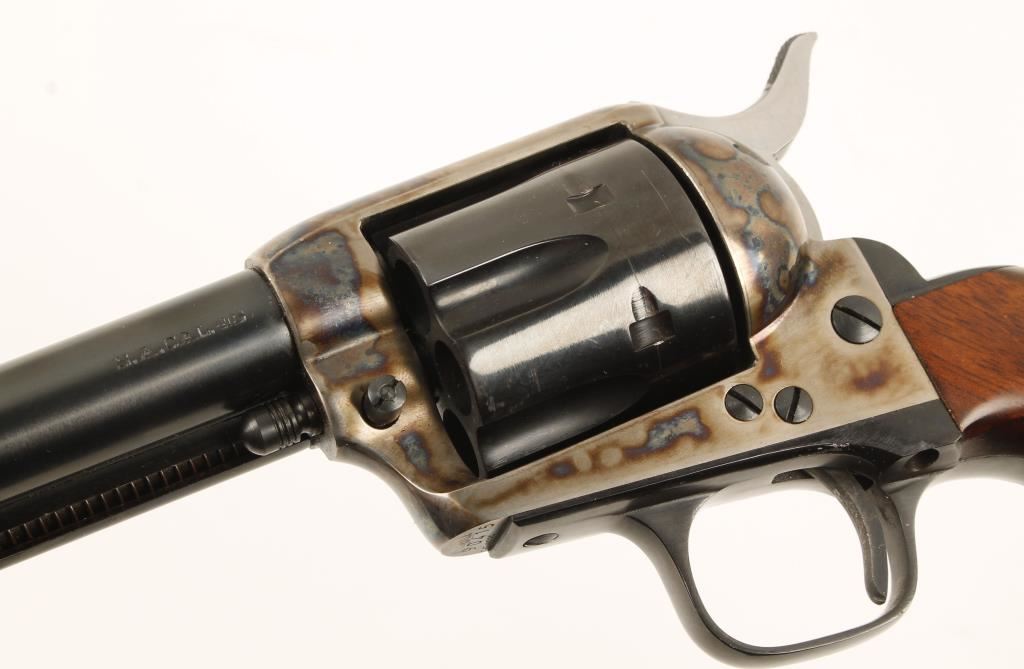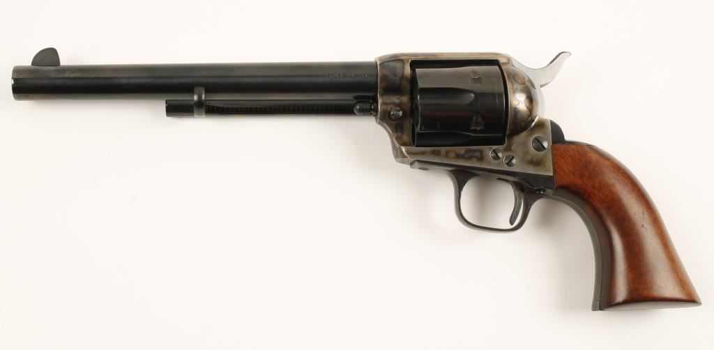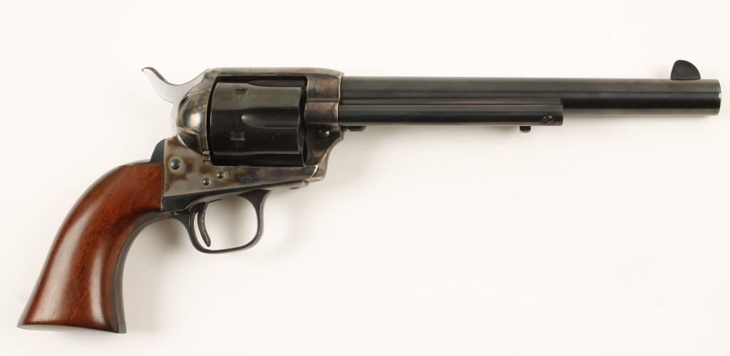 Italian made six shot revolver chambered in .45 Colt and modeled after the Colt Single Action Army. Features a 7.5" blued barrel, fixed sights, case hardened frame, blued cylinder, trigger, hammer, trigger guard & backstrap, checkered hammer spur and one piece walnut grips. Revolver retains 90% original finish with the only substantial loss to finish on the trigger guard. Bore is dull with strong rifling and action is very nice. Condition is very good+. ***Modern Firearm***