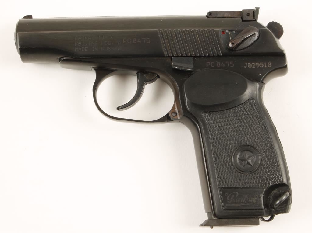 Blued Russian made semi automatic pistol chambered in 9x18mm Makarov. Features a 3.6" blued barrel, fixed front sight, adjustable rear sight, rounded serrated hammer, thumb safety switch, single stack 8 round magazine, lanyard ring and black checked wrap around grips. Finish retains 95%+ original bluing, bore is bright with good rifling and action is very smooth. Condition is excellent. ***Modern Firearm***