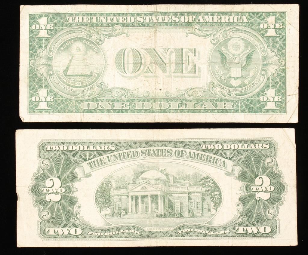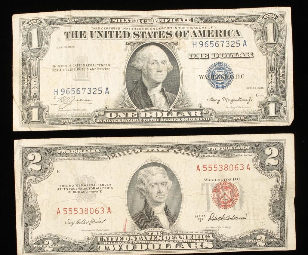 1-$2 Note backed only by the credit of the U.S. Government and was redeemable for gold or silver. 1 Silver Certificate minted when the U.S. backed their currency with silver. They were recalled in 1966 and are no longer in circulation.